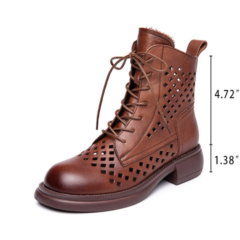 ハンドメイド本革中空ブーツ レディース 通気性 夏靴 サイドジッパー アンクルブーツ ブラウン/ブラック