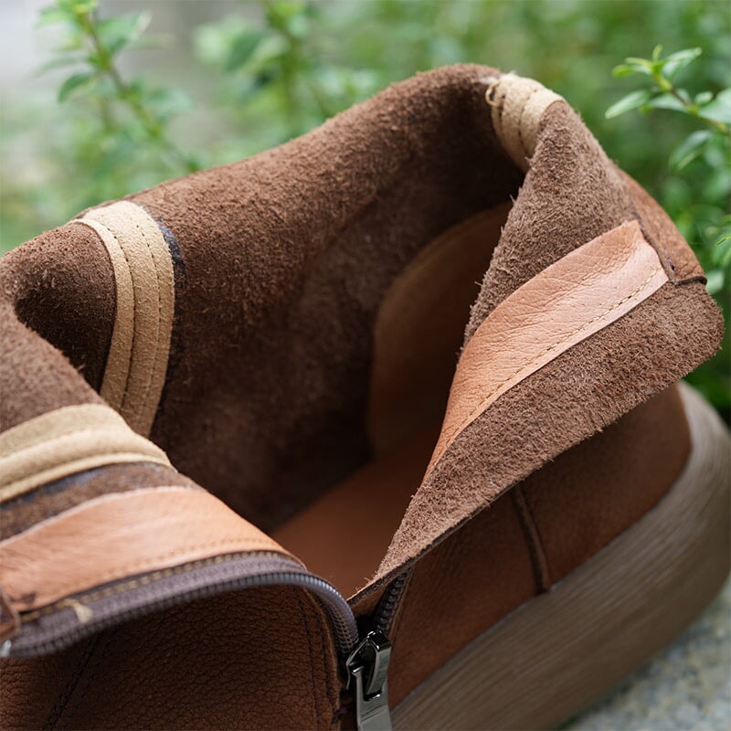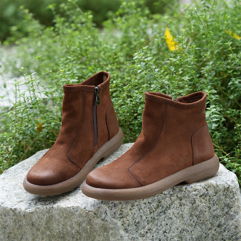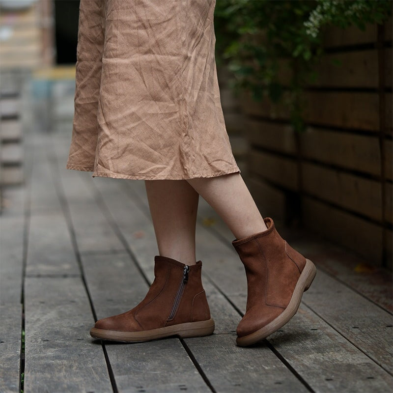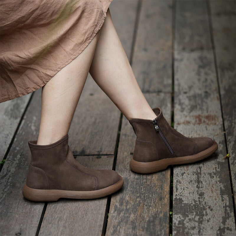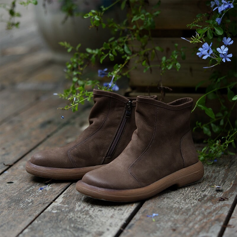 レトロレザーアンクルブーツ レディース フラットシューズ サイドジッパー グレー/コーヒー