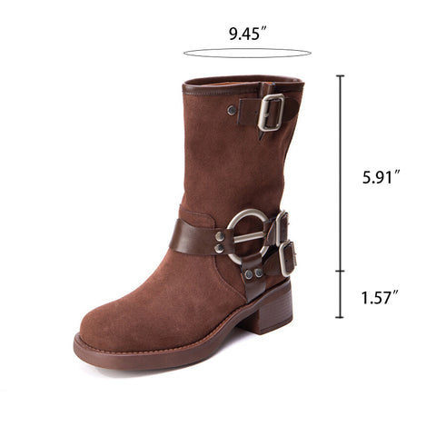 これらのウエスタンブーツはスエード牛革で作られており、カウボーイ風のバックルとチャンキーヒールが付いています。快適で、足を長く見せてくれます。