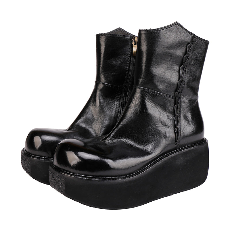 レディース用レトロブーツ レザープラットフォームブーツ ブラック