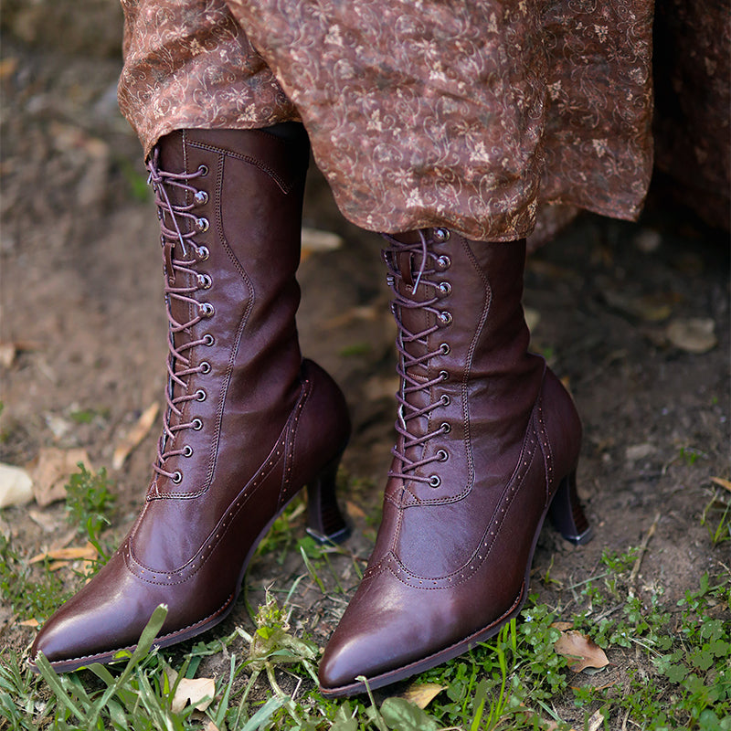 Step back in time with these Edwardian lace-up boots, inspired by antique originals from 1890 through 1920. Handcrafted from soft, top-grain cowhide leather with genuine leather-wrapped heels, these elegant mid-calf boots feature a refined point toe and an 70mm spool heel for a graceful silhouette. The curved back seam and delicate broguing capture true vintage charm. Built on a high-elastic, non-slip rubber sole, they’re as practical as they are beautiful—crafted by skilled artisans to last for years. Perfect for Lolita fashion, vintage enthusiasts, and anyone who loves to express a soft, romantic classical court style.