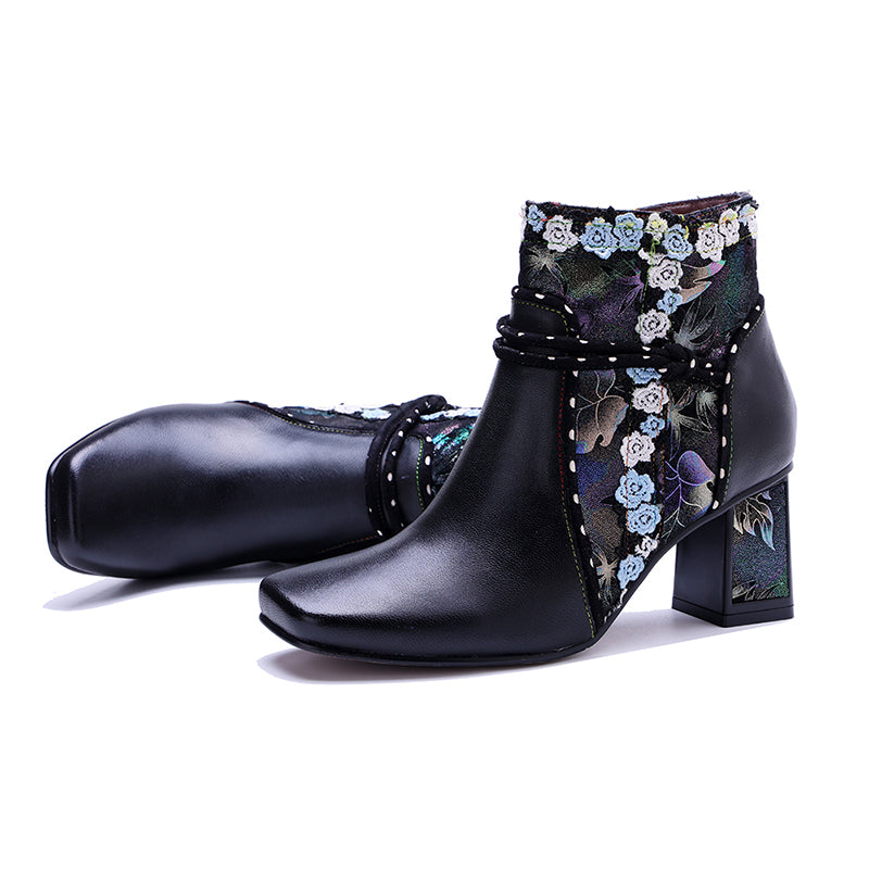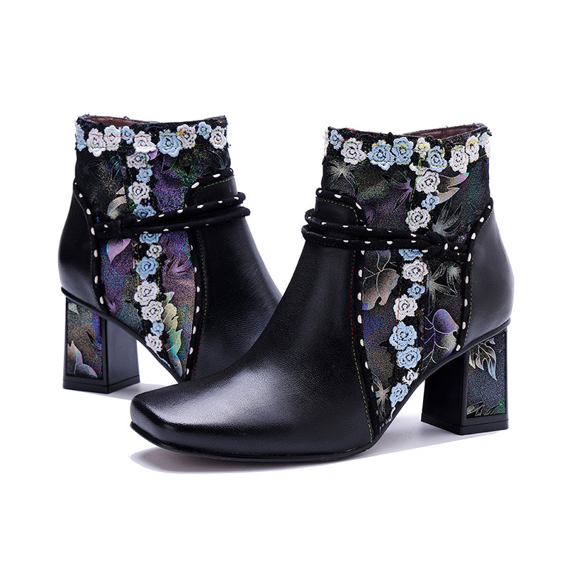 Step into timeless elegance with these vintage Bohemian ankle boots, featuring a stylish square toe and a stable block heel for all-day comfort. Crafted from premium sheepskin leather and sheepskin suede, the upper showcases an artistic floral fabric panel with a chic lace-up (wrap tie) design, creating a unique designer look. The side zipper allows easy wear, while the durable rubber outsole offers excellent grip and support. Each pair is carefully handmade by skilled craftsmen, ensuring exceptional comfort, quality, and long-lasting retro charm.