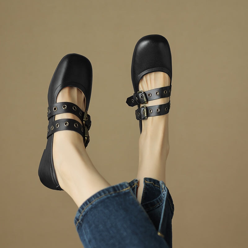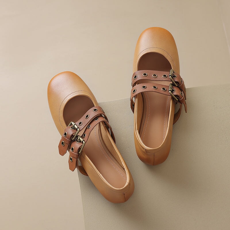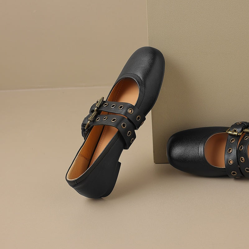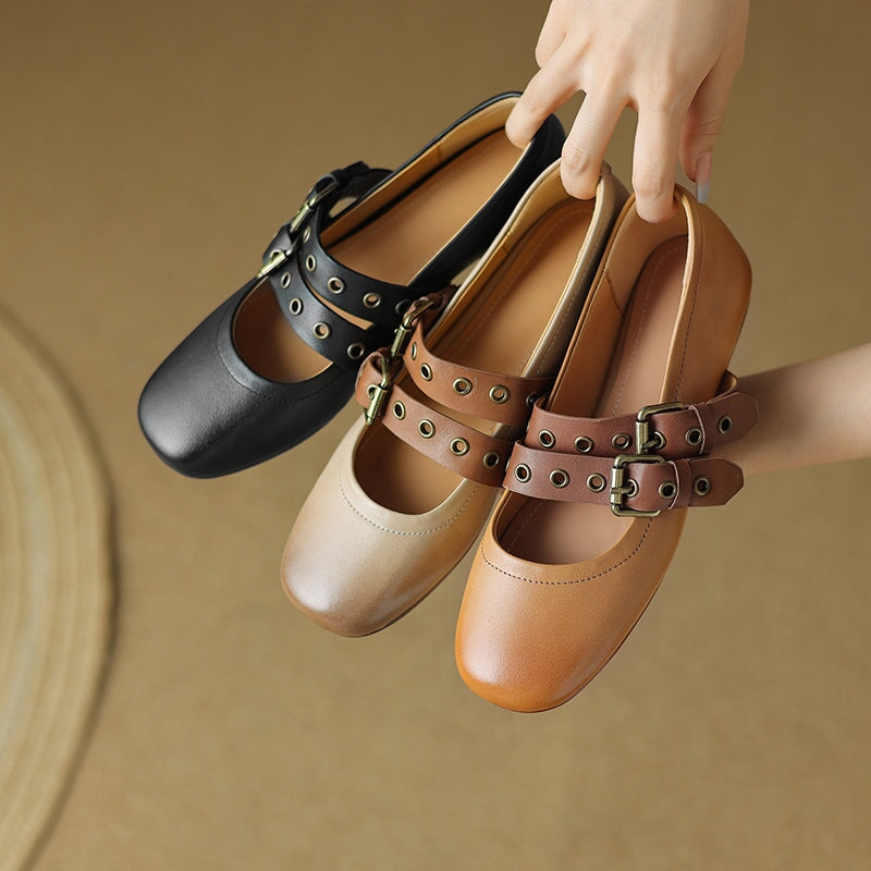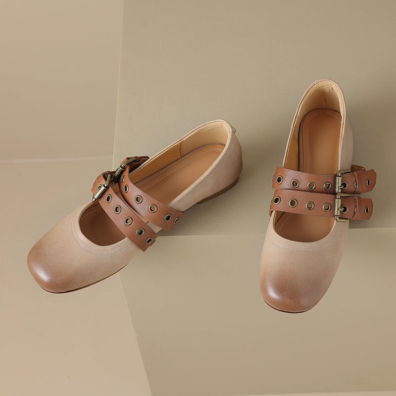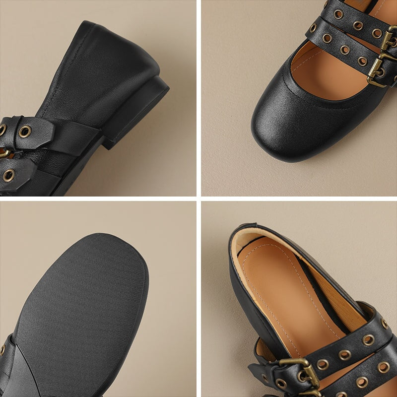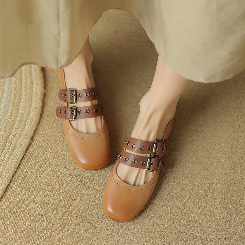 ハンドメイドレザーメリージェーンフラットダブルストラップリベットドレスシューズブラウン/ブラック