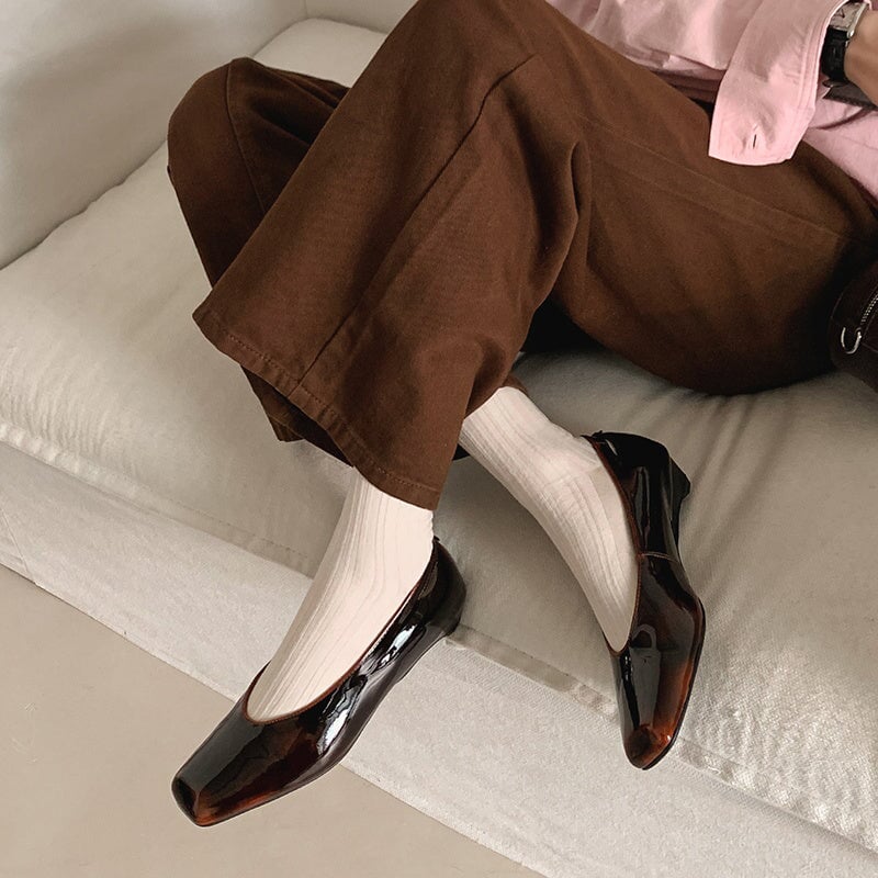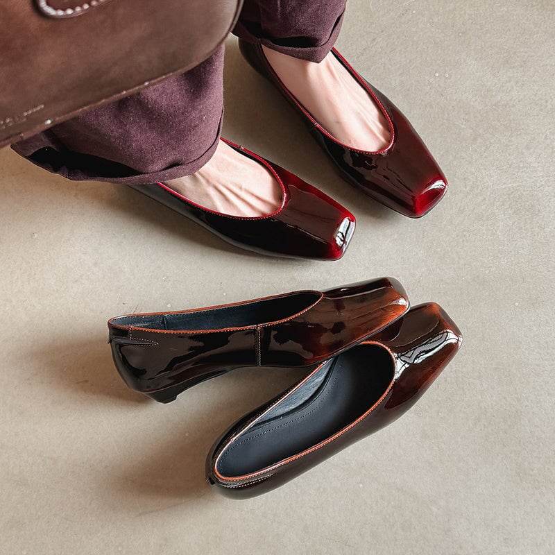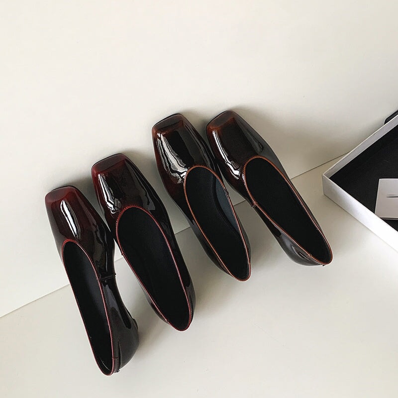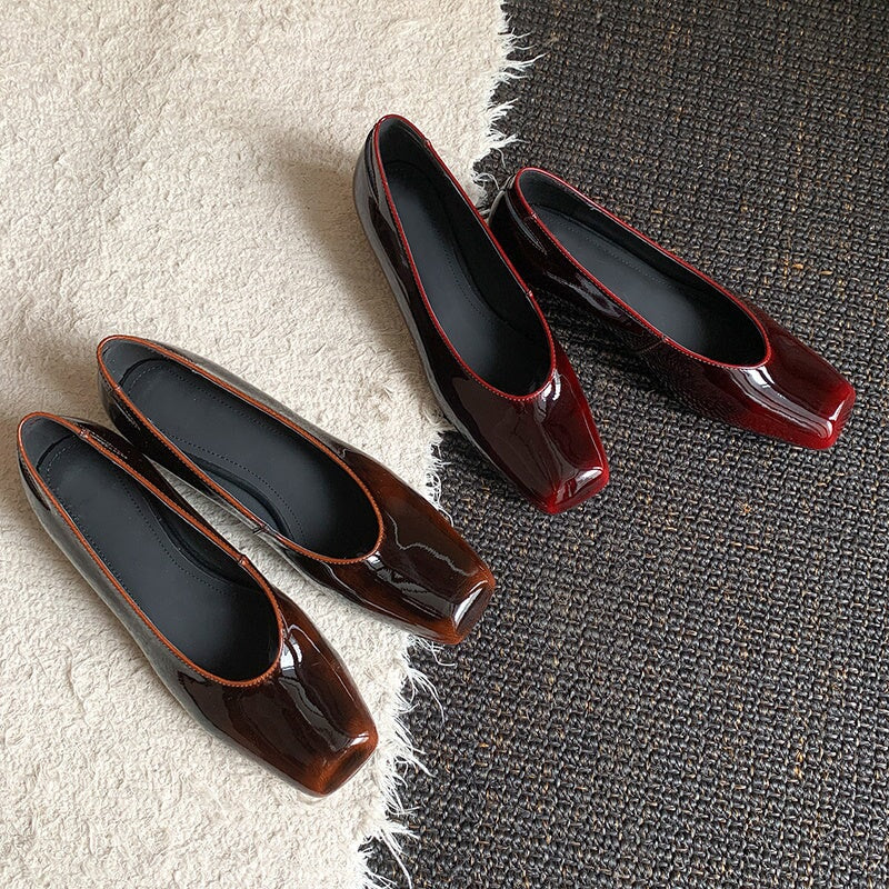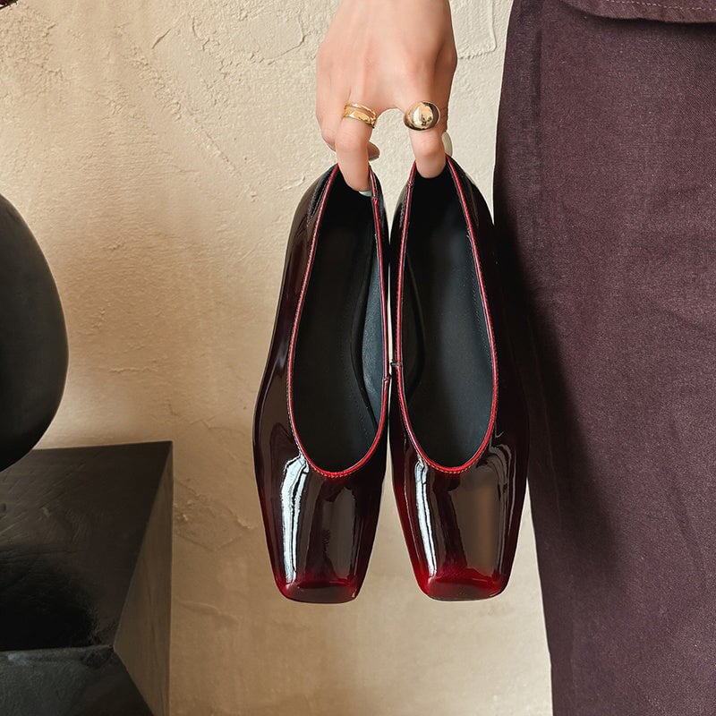 Step into understated elegance with these square-toe ballet flats, crafted from glossy cow leather. Designed for all-day comfort, they feature a low block heel, slip-on design, and durable rubber sole. A perfect blend of minimalism and fashion, these casual flats are ideal for both work and weekend wear.