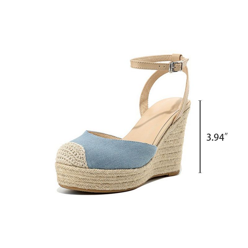 100mm Slingback Espadrille-Wedge Leather Sandals Ankle Strap in Apricot/Blue