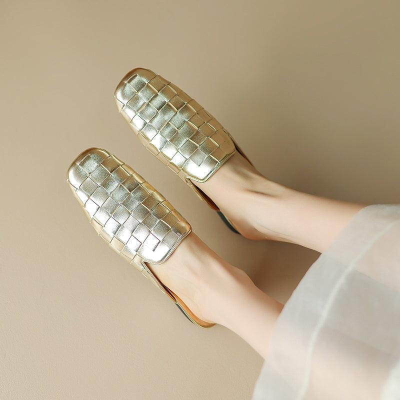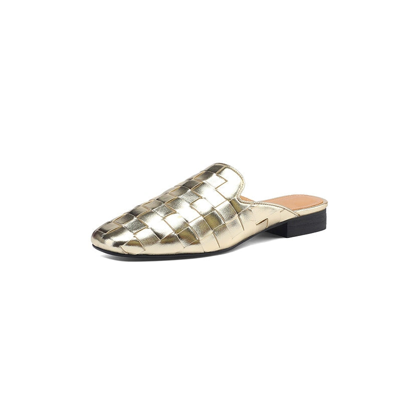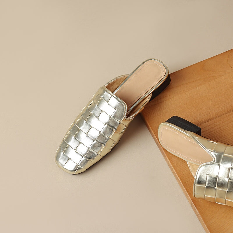 Fashion Genuine Sheepskin Woven Leather Mules Slippers for Women in Beige/Golden/Black