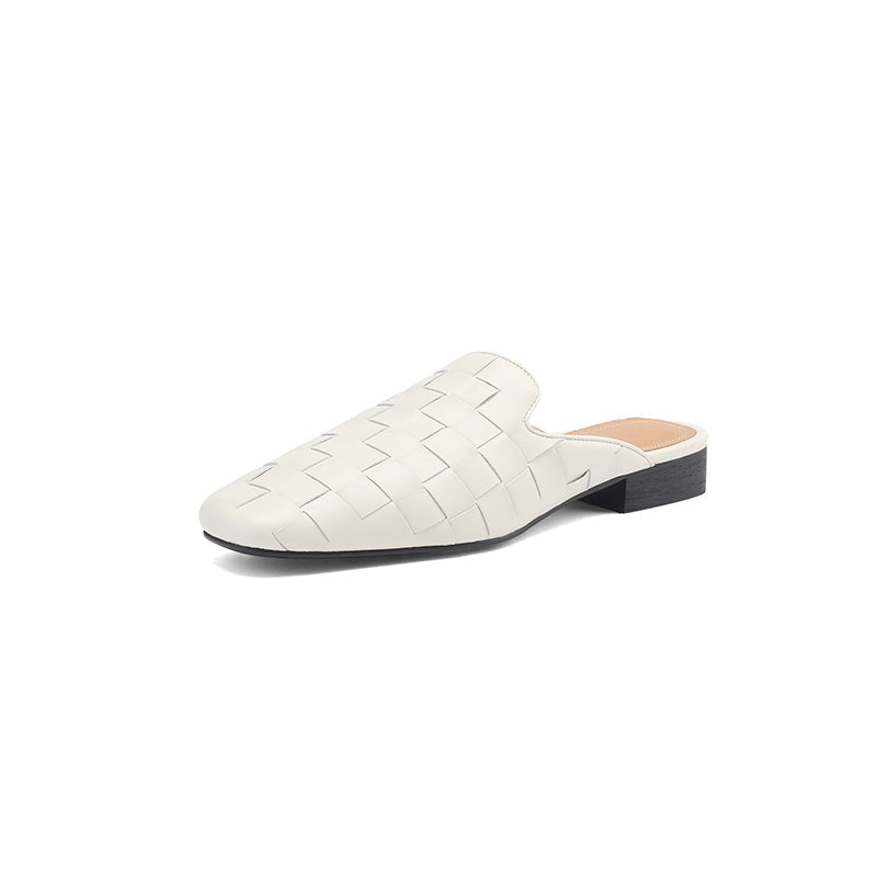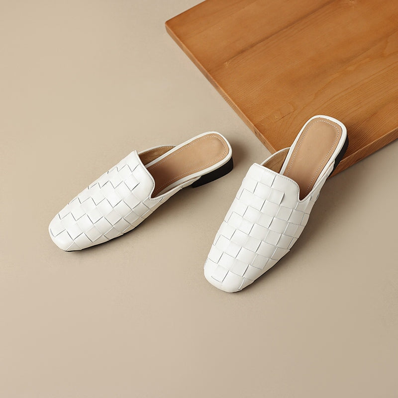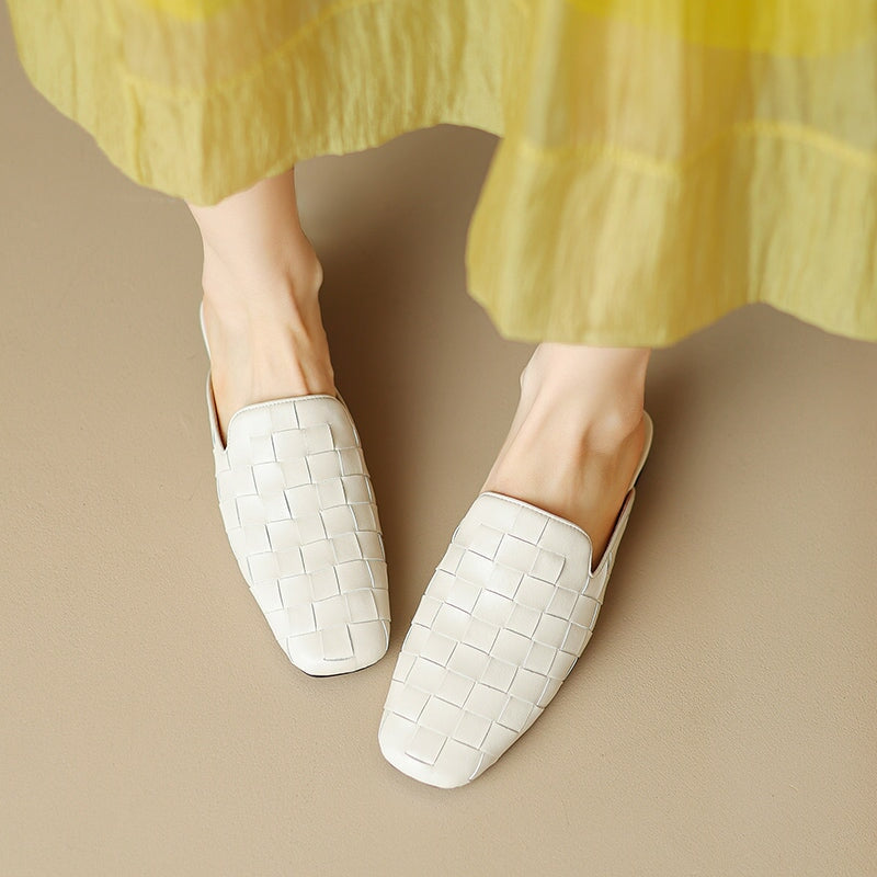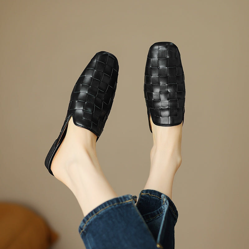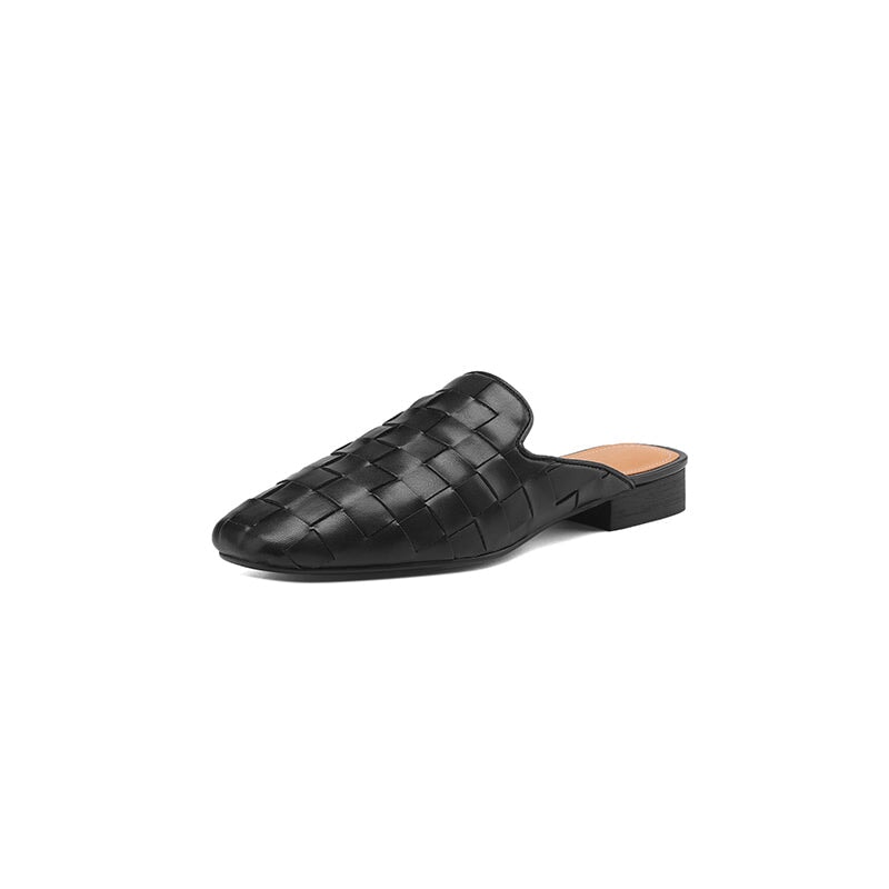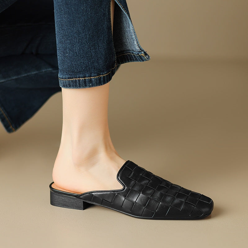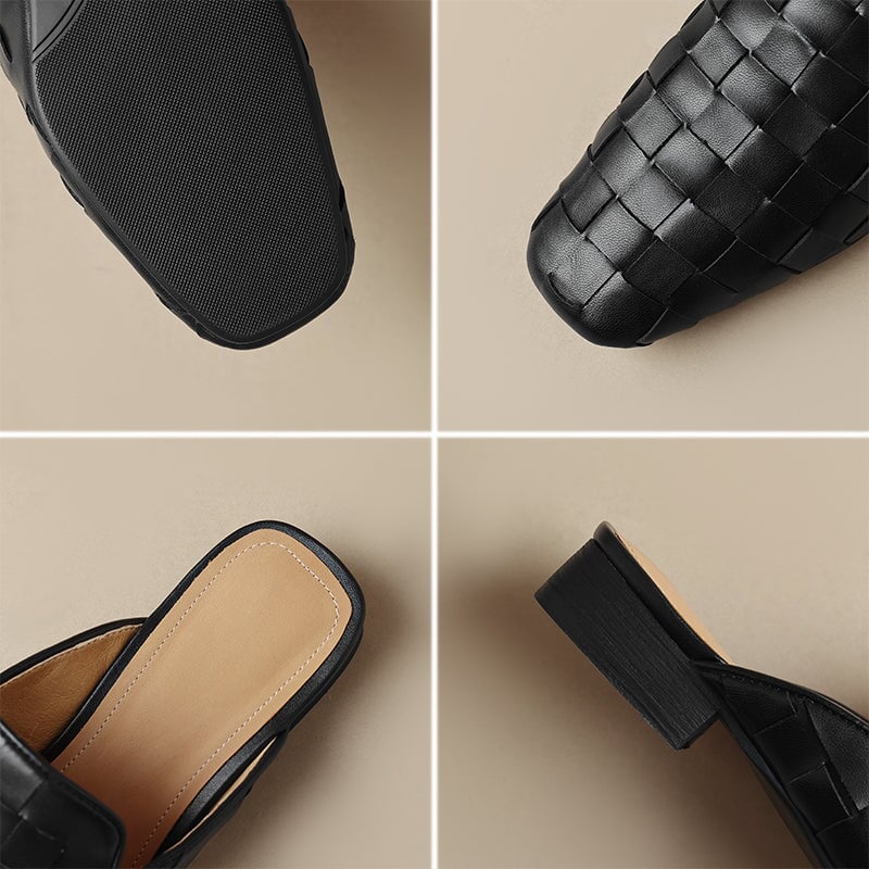 Step into effortless elegance with these fashion-forward women's woven leather mules. Made from soft genuine sheepskin leather, these square-toe slip-on slippers feature a sleek woven design that adds texture and sophistication. The low block heel offers subtle height with everyday comfort, while the rubber outsole provides durability and traction. Perfect for chic office looks, casual outings, or elevated minimal style.