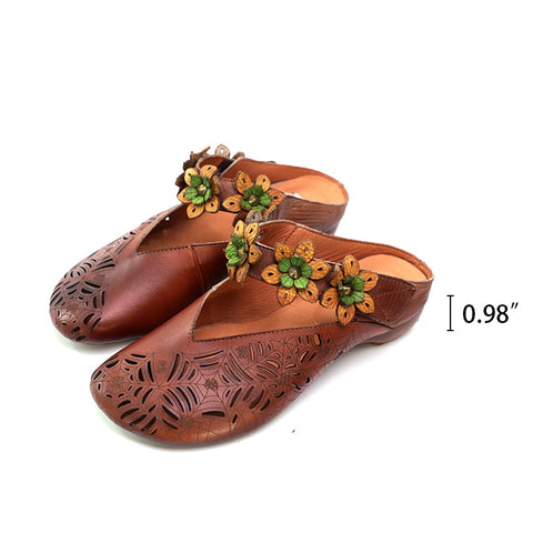レトロレザースライドサンダル 夏用スリッパ ハンドメイドミュール 花柄 コーヒー/パープル