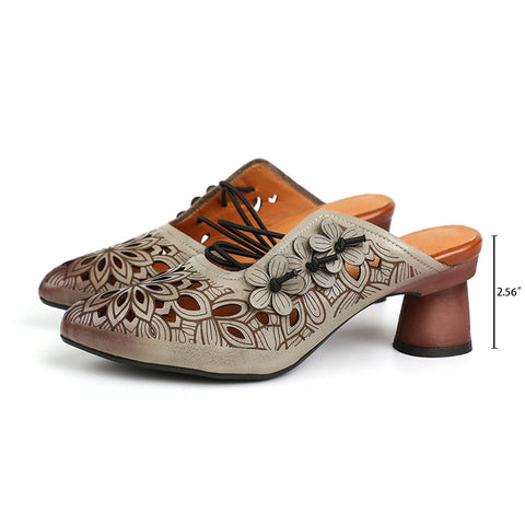 レトロスタイル レザー ポインテッドトゥ ミュール レディース ブロックヒール コーヒー/グレー
