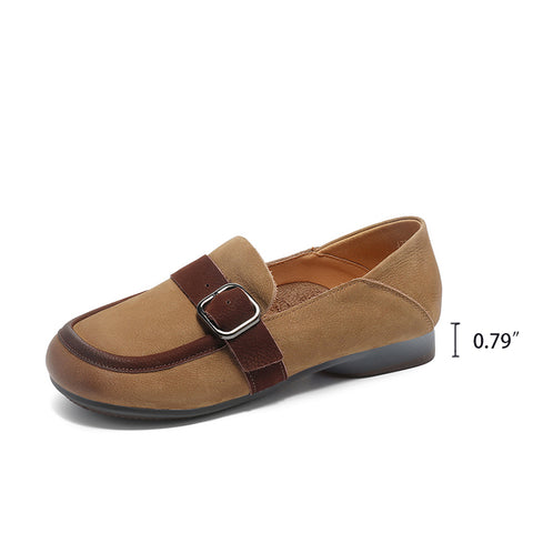 レディース ソフトレザー ローファー メタルバックル付き カーキ/ブラウン