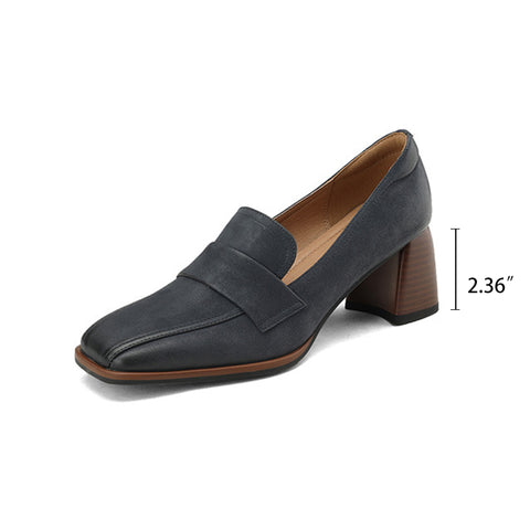 レディースハンドメイドレトロスクエアトゥブロックヒールローファー ブルー/アプリコット