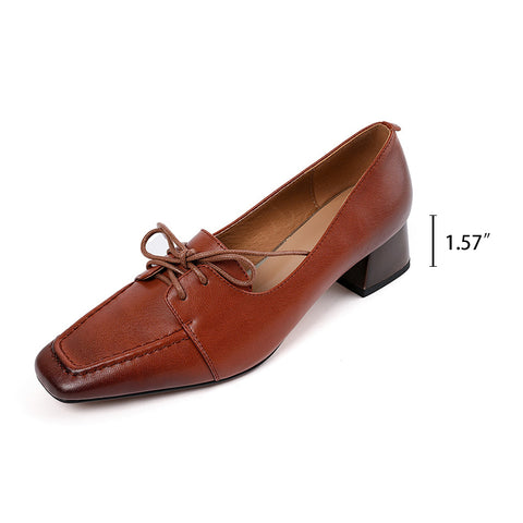 レディース ハンドメイド ソフトレザー レースアップ ブロックヒール スリッポン パンプス ローファー ブラウン/ブラック