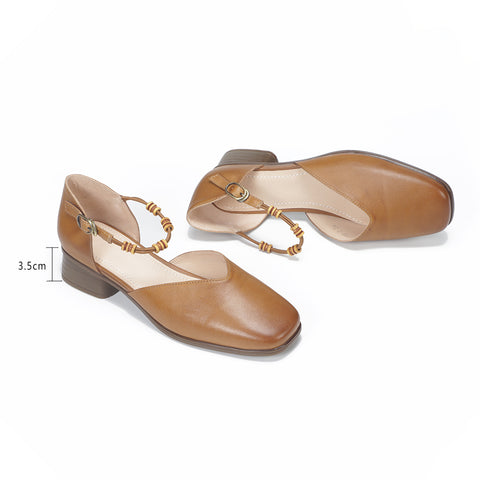 本革スクエアトゥブロックヒールメリージェーンエレガントシューズコーヒー/ブラウン