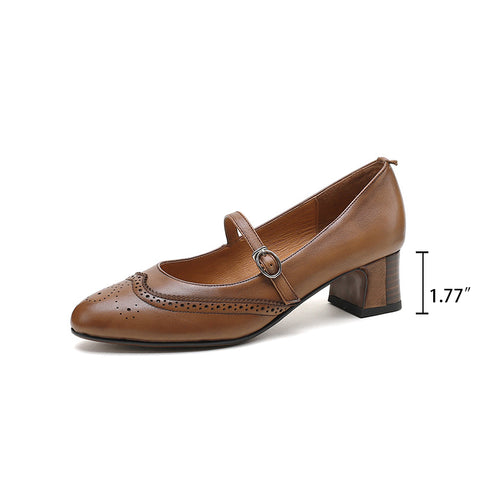 尖ったつま先、甲ストラップディテール、ブローグ付きメリージェーンパンプス、50mmブロックヒール。トップレイヤーレザー製、柔らかく、柔軟で快適、ハンドカット、メタルバックル、あなたのユニークな美しさを身に着けてください。