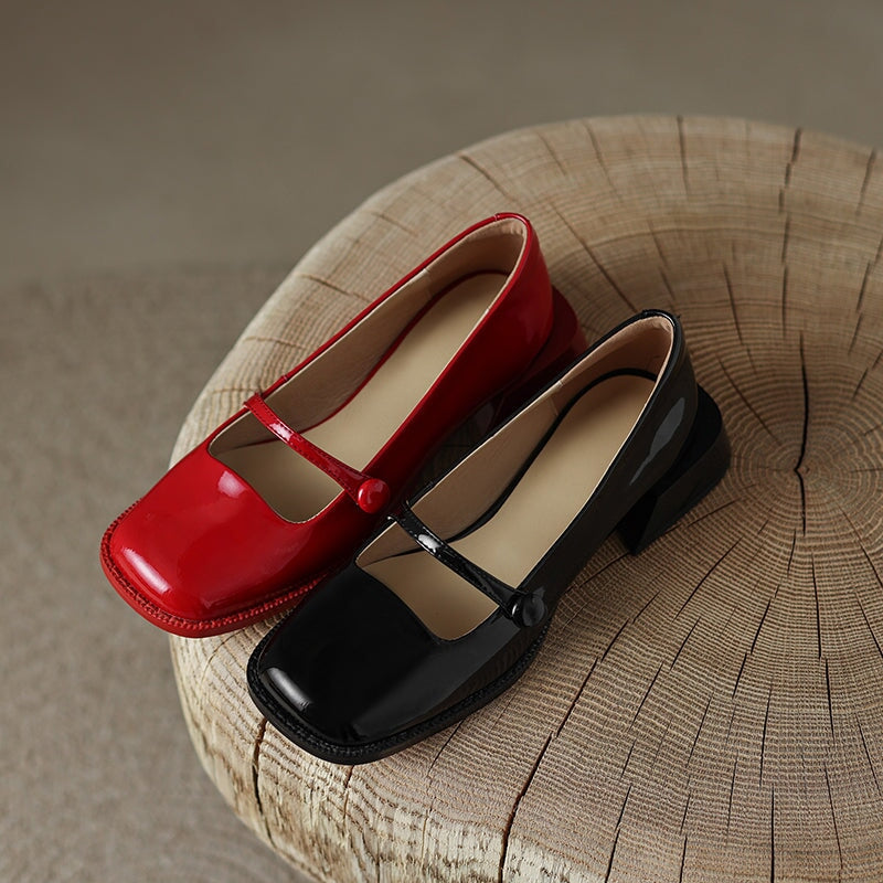 ハンドメイドのパテントレザー メリージェーンパンプス ブロックヒール オフィスシューズ レッド/ブラック