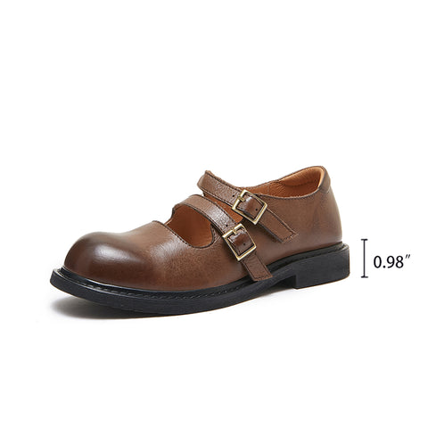 レザー メリージェーン パンプス ダブルストラップ ブロックヒール ドレスシューズ コーヒー/ブラック