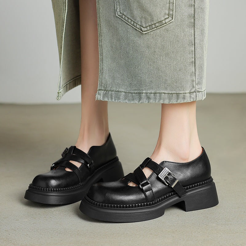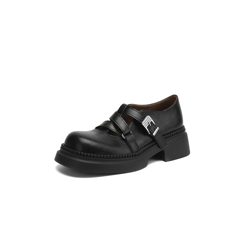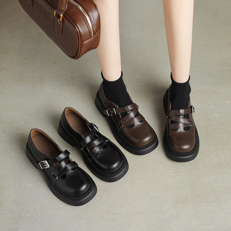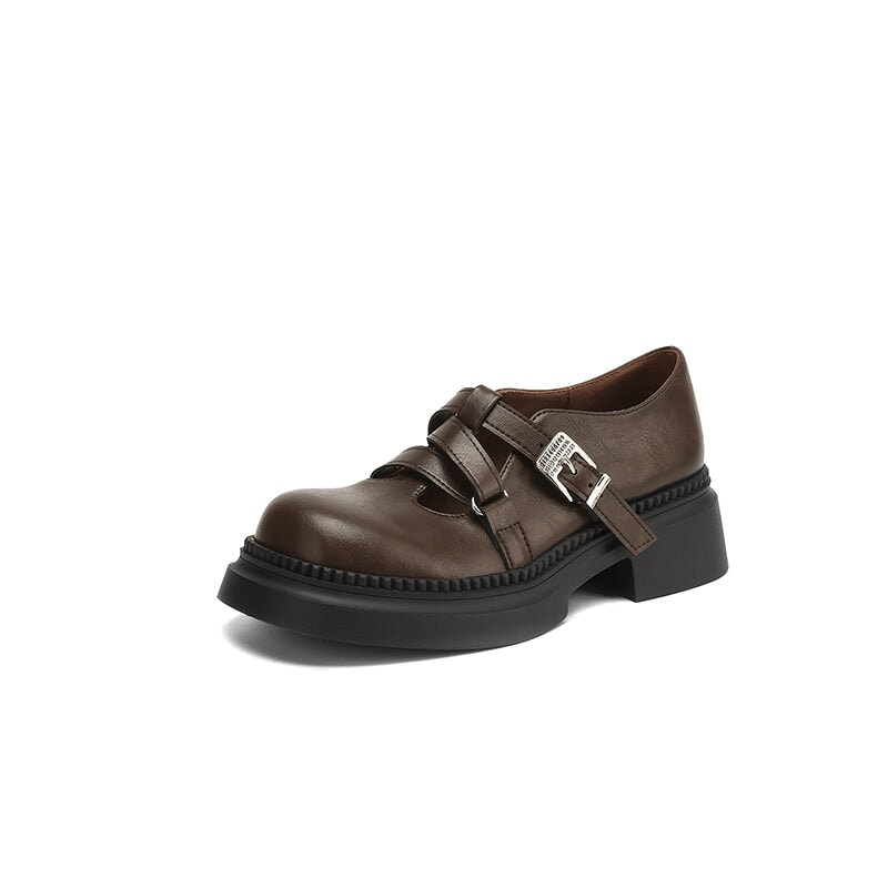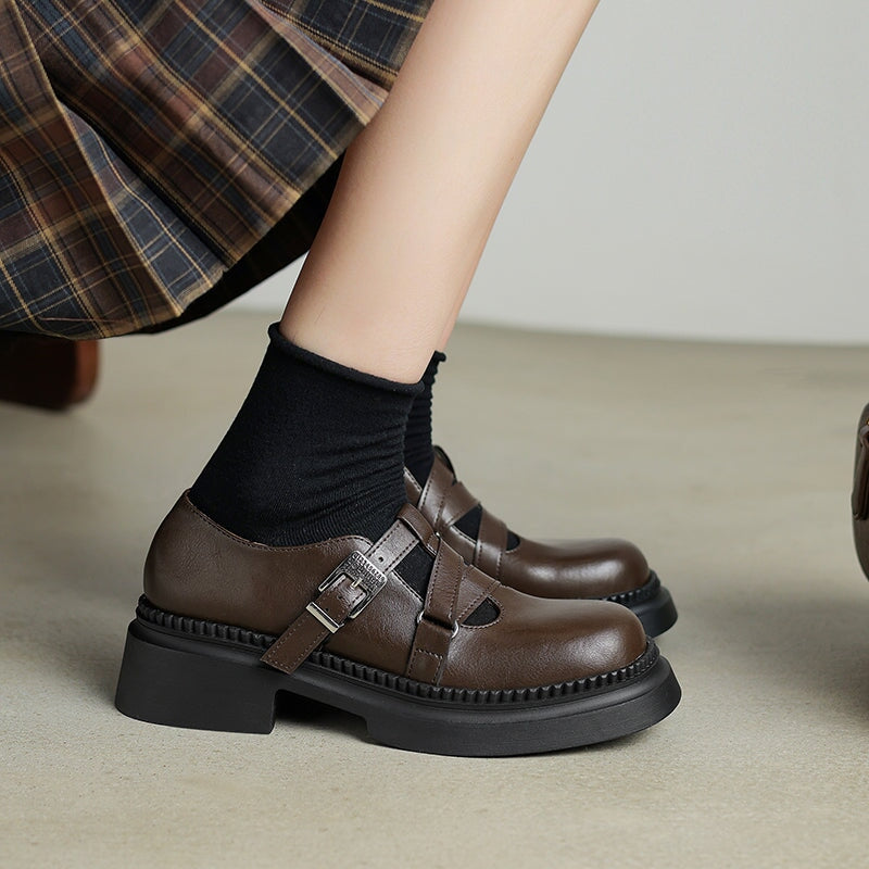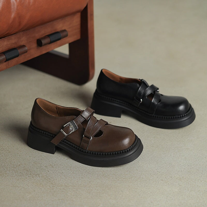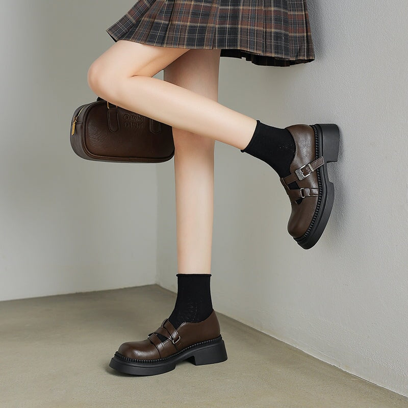 レザー ダブル T ストラップ メリージェーン シューズ ラウンドトゥ 50mm ブロックヒール ブラウン/ブラック