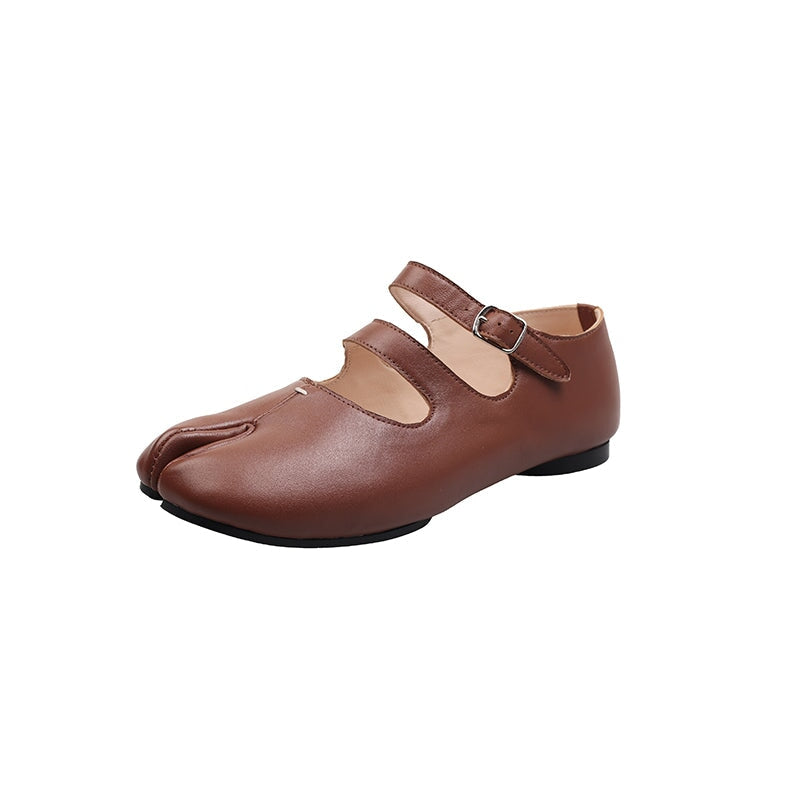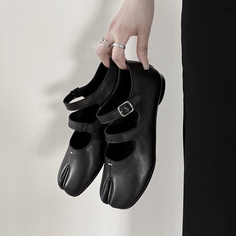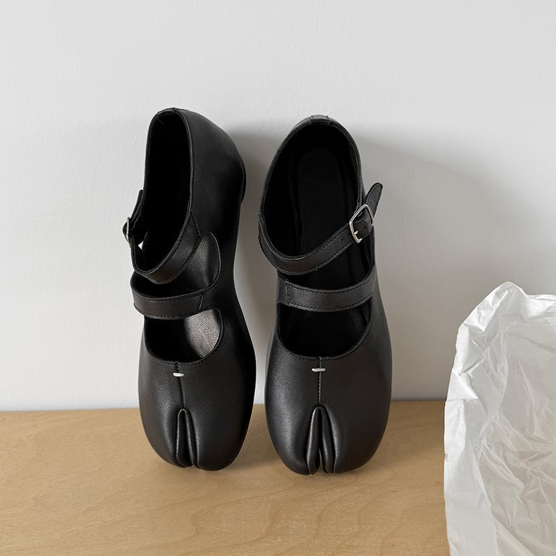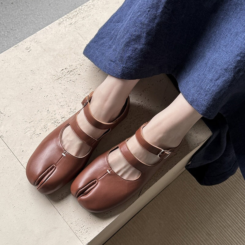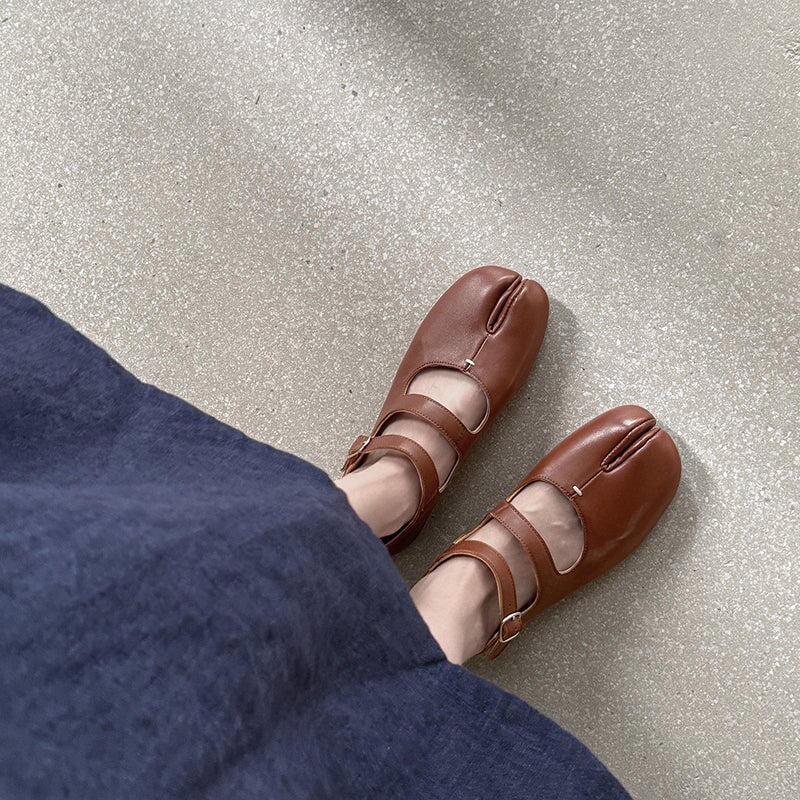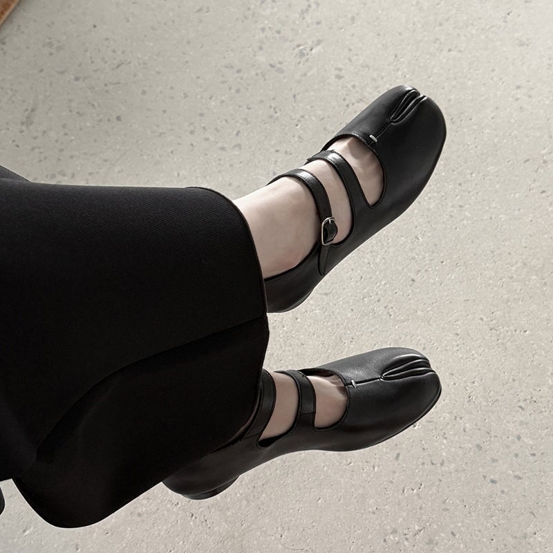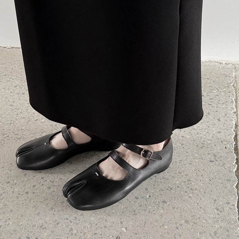 Step into unique comfort with these Split Toe Mary Jane Flats, crafted from premium top-grain sheepskin leather. Designed with a stylish double strap and Japanese-inspired tabi silhouette, these shoes combine elegance and everyday ease. The rubber sole ensures flexibility and grip, perfect for casual wear.