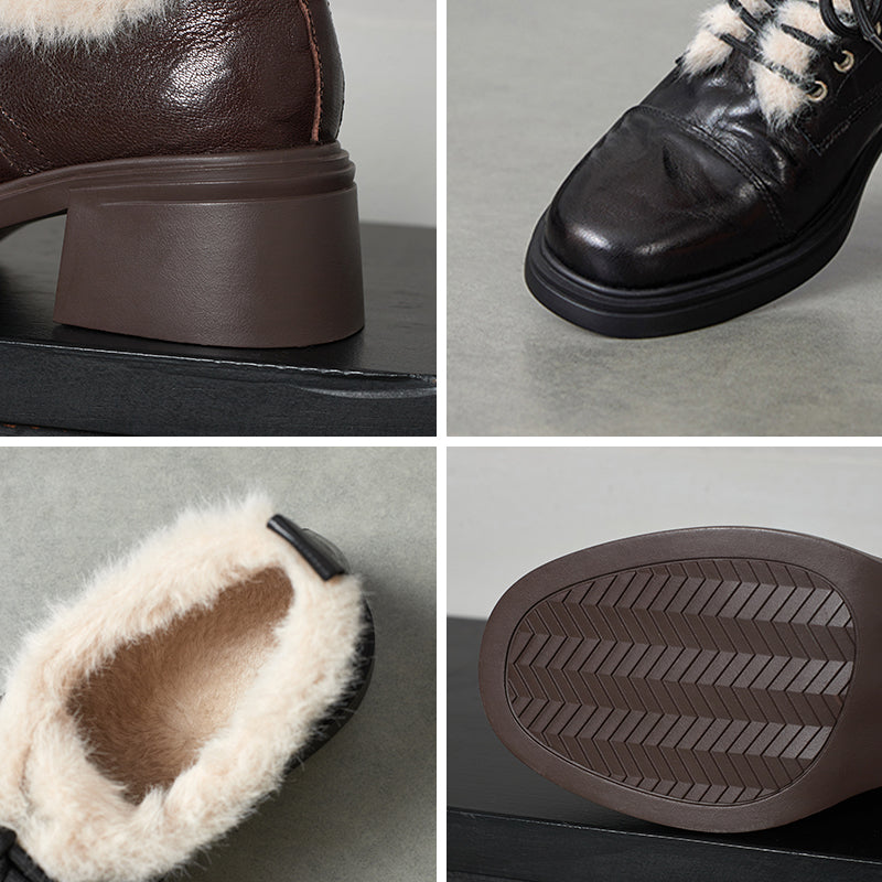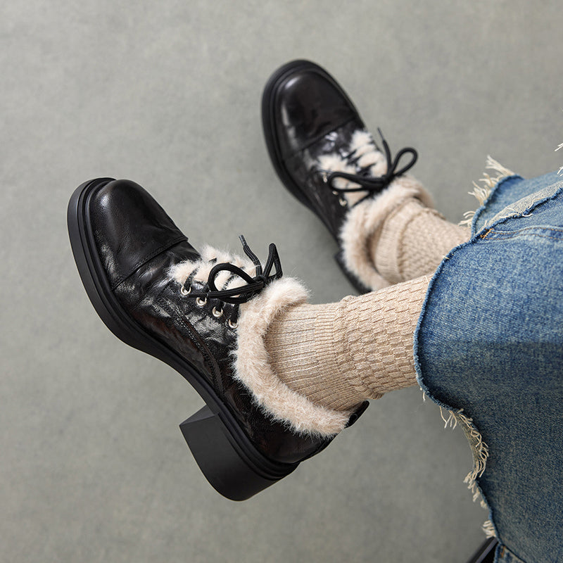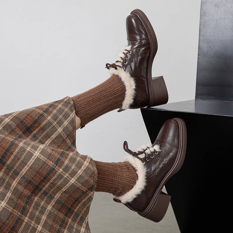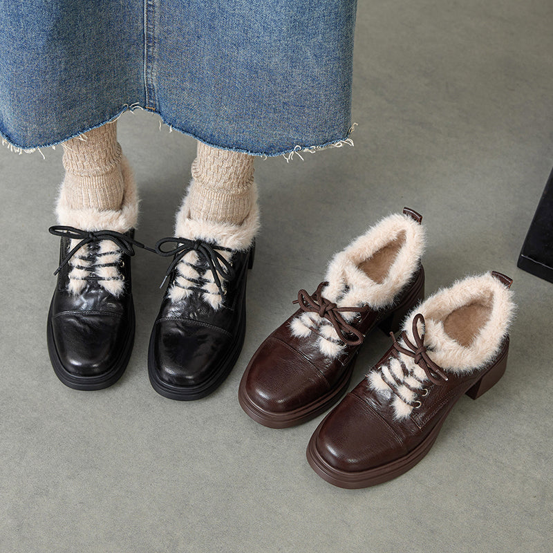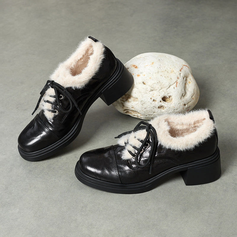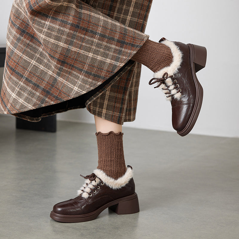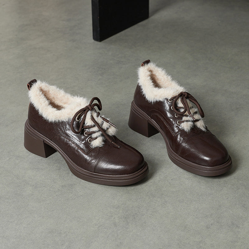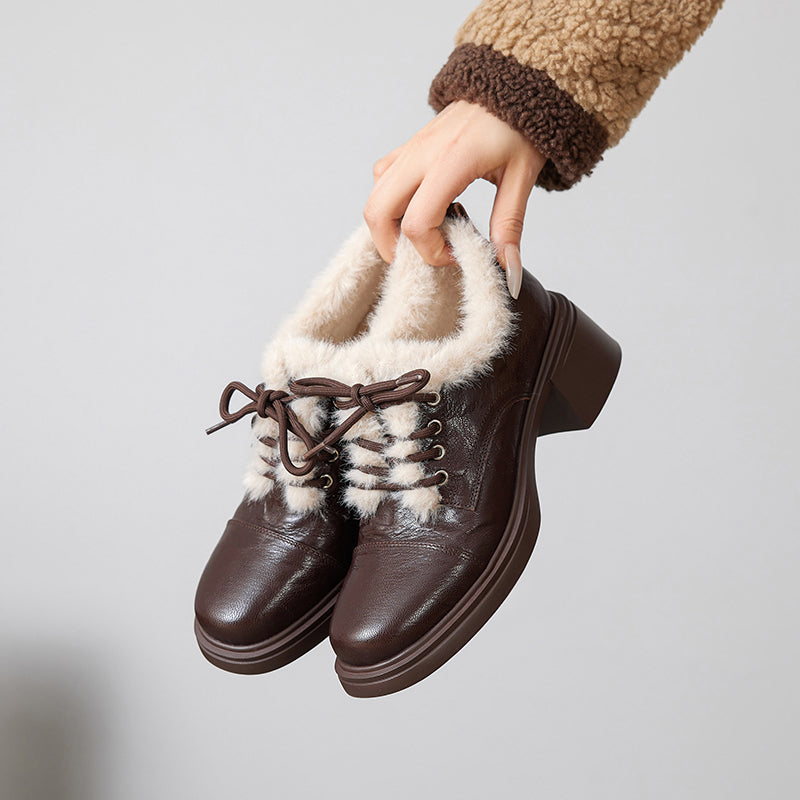 Winter Sheepskin Leather Lace-Up Oxford Shoes with 55mm Block Heel in Black/Brown