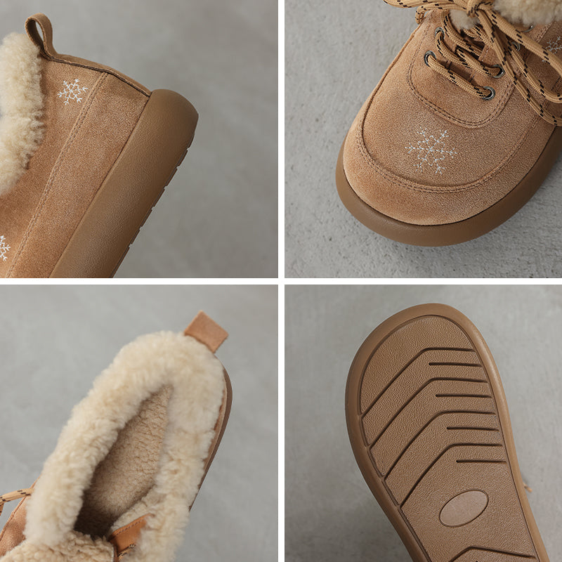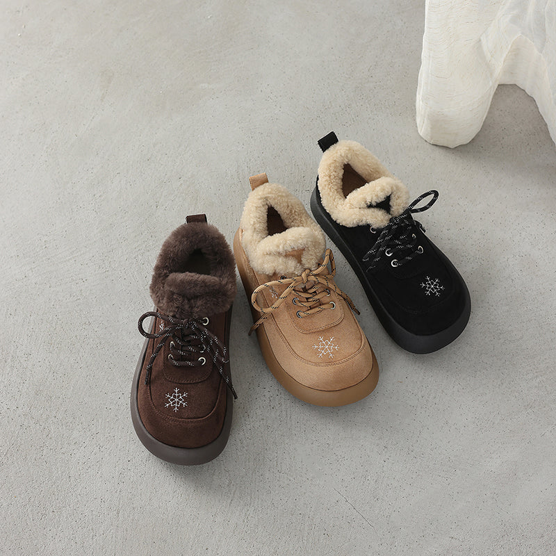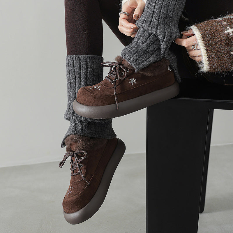 Winter Suede Leather Lace-Up Oxford Flats with Snowflake Embroidery in Apricot/Black/Dark Brown