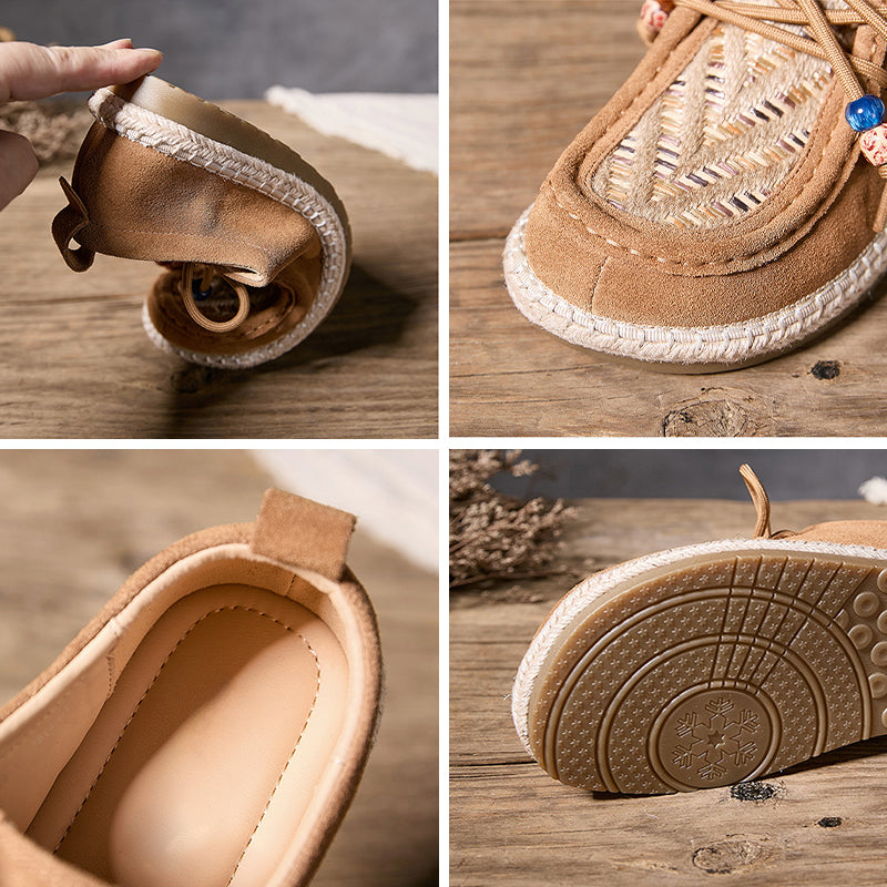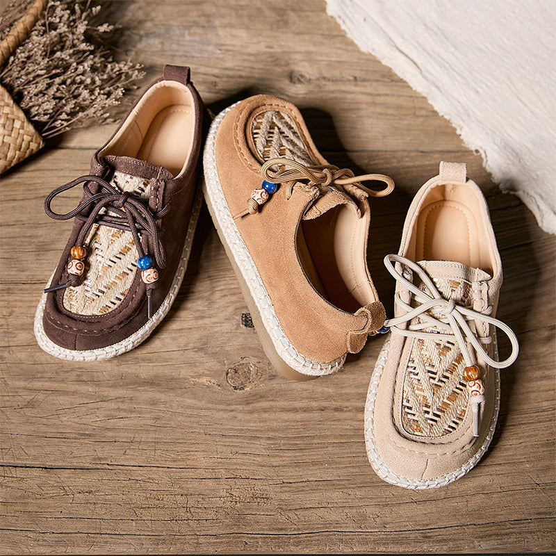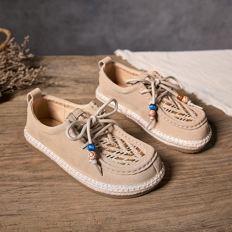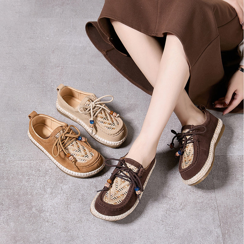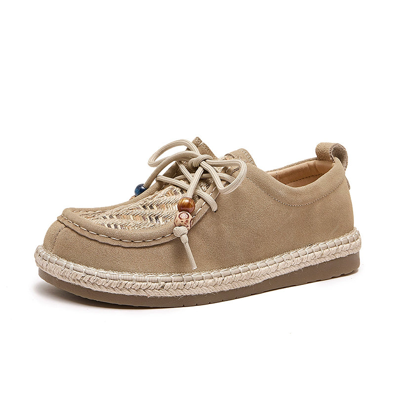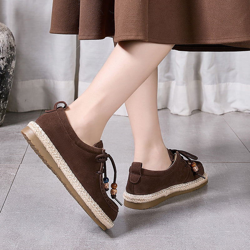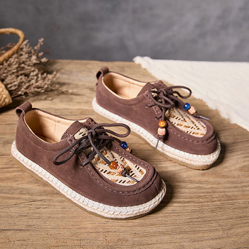Women’s Bohemian Espadrille Oxford Shoes Lace-Up Suede Leather Casual Flats in Coffee/Caramel/Apricot