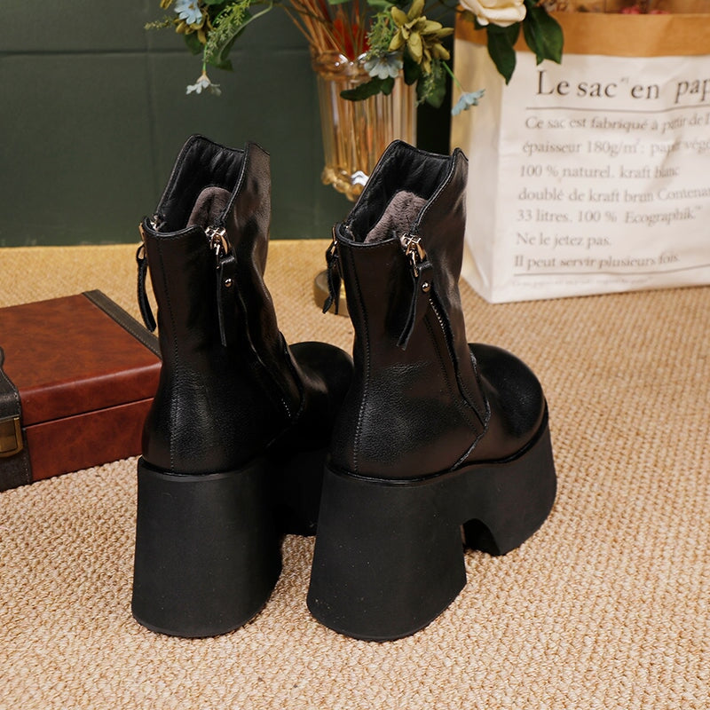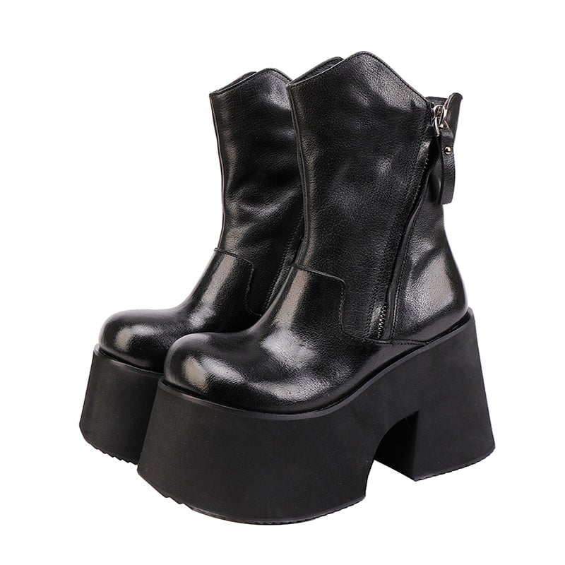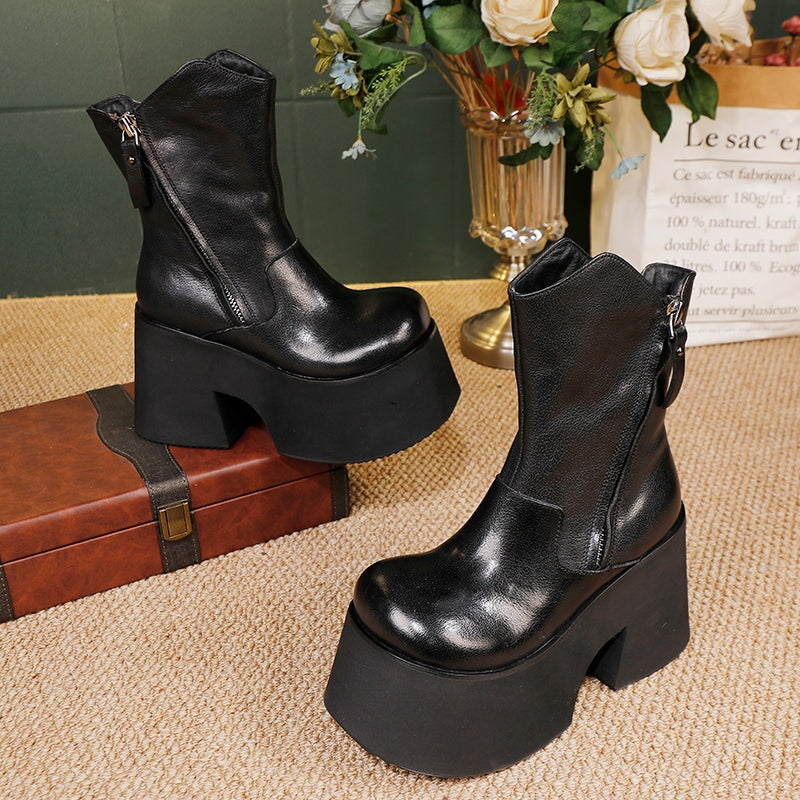 50mm プラットフォームブーツ バックジップ レザー マーティンブーツ ラウンドトゥ コンバットブーツ ブラウン/ブラック