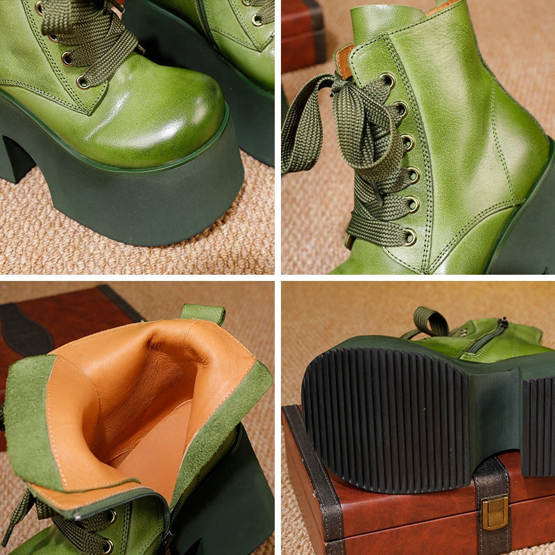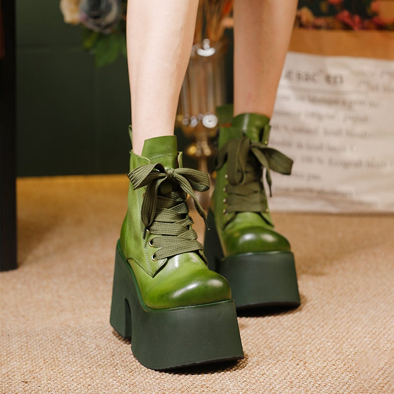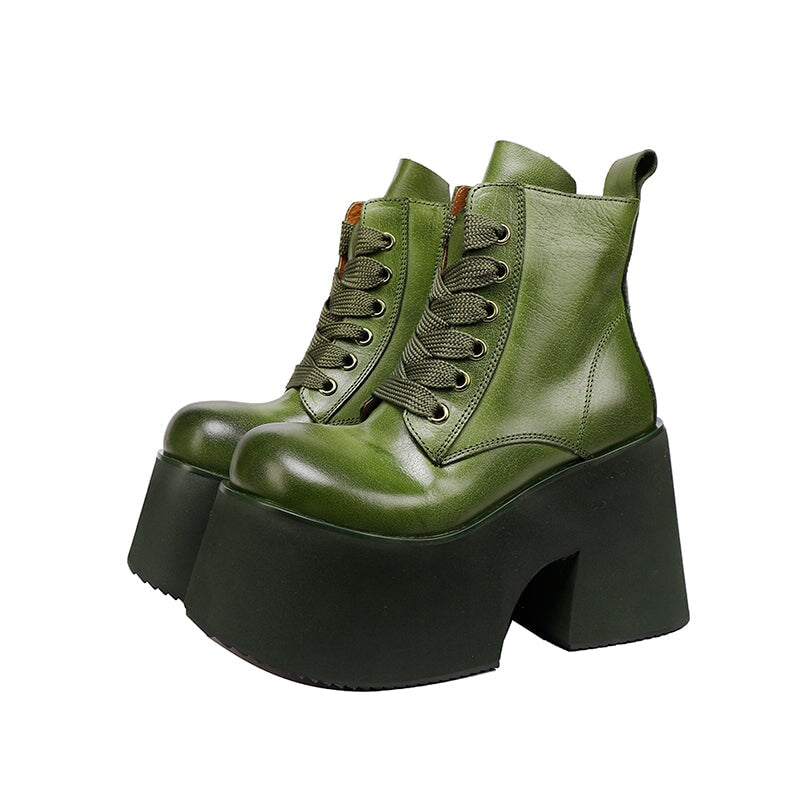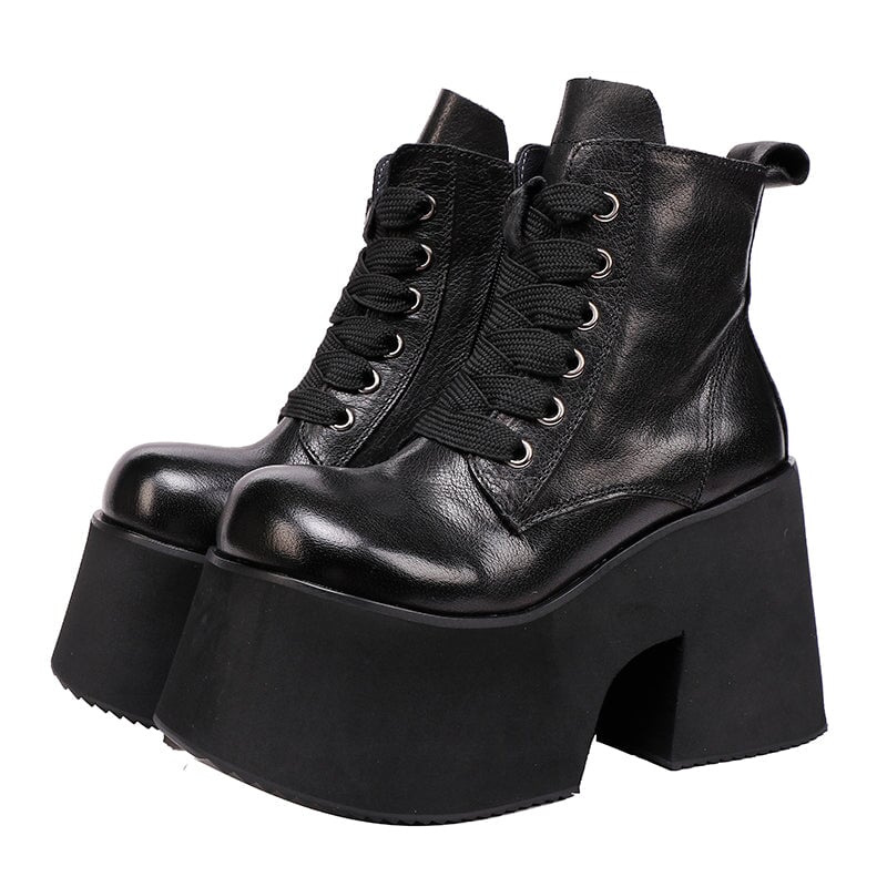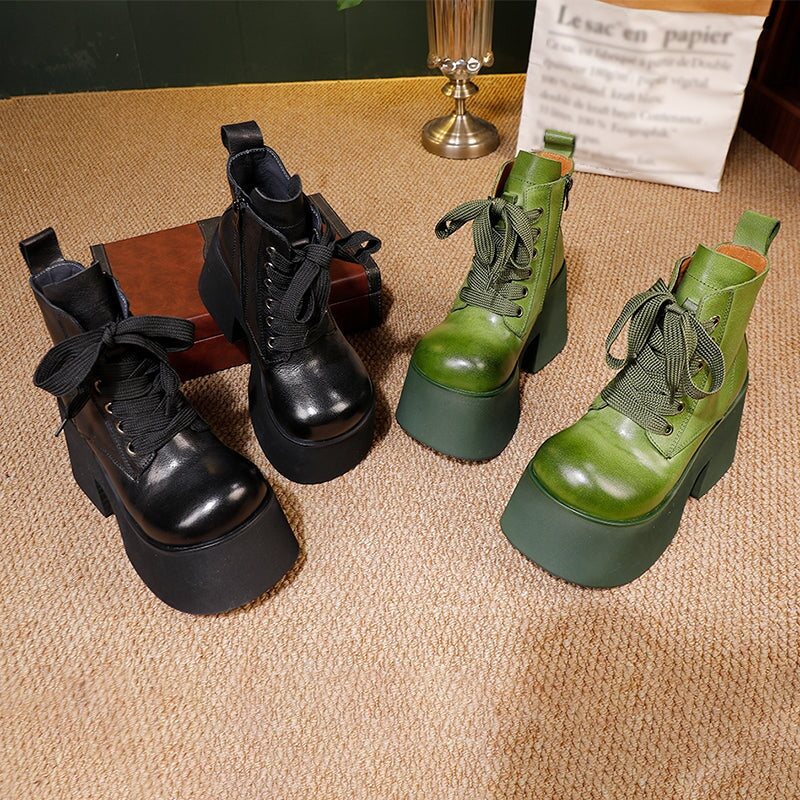 50mm プラットフォームブーツ レースアップレザーマーティンブーツ ハンドメイドコンバットブーツ コーヒー/ブラック