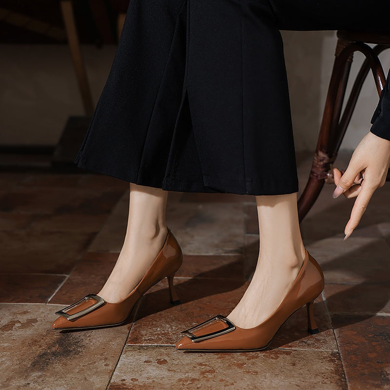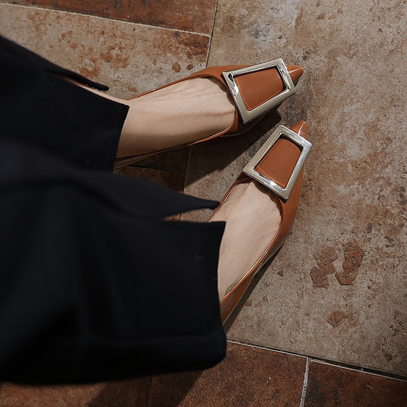 ユニークなスクエアボタンデザイン、エナメル牛革のアッパーとシープスキンのライニングとインソール、スクエアトゥ、甘い感触。