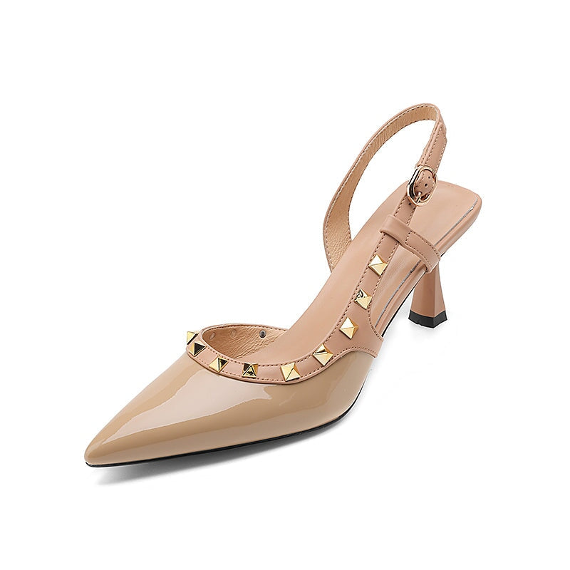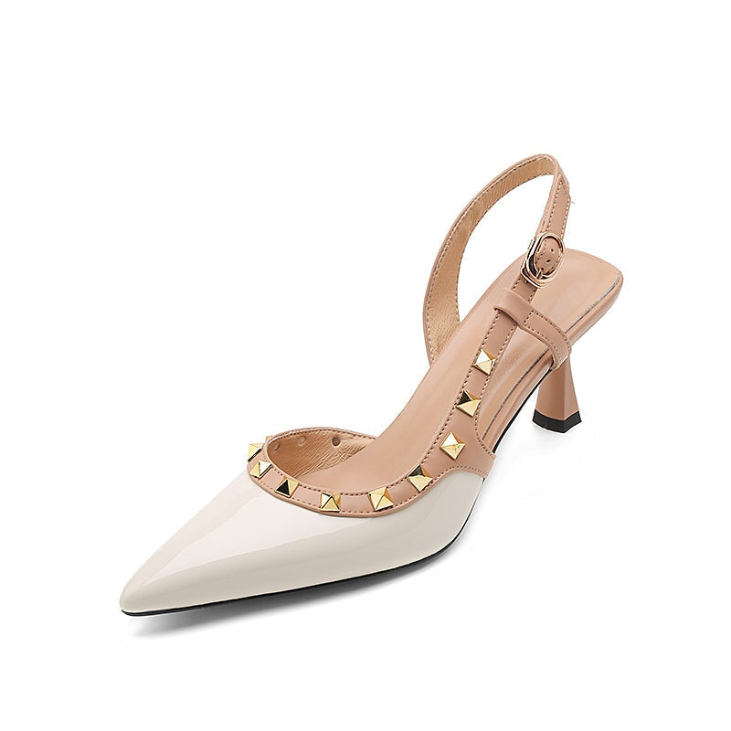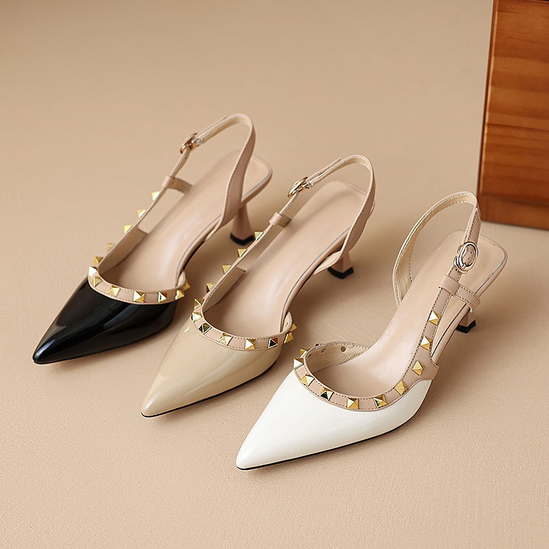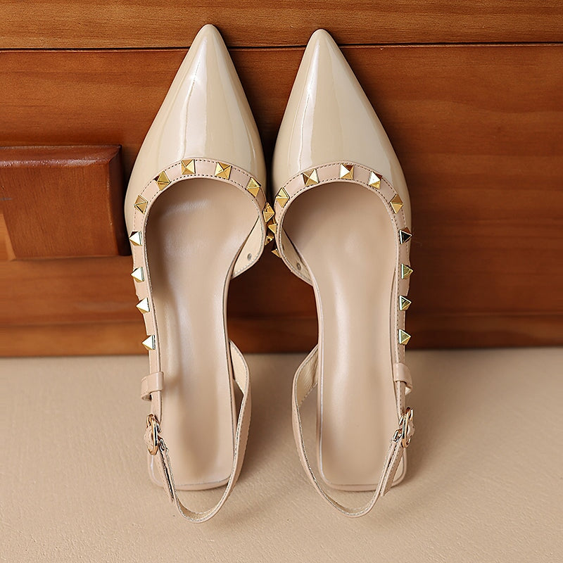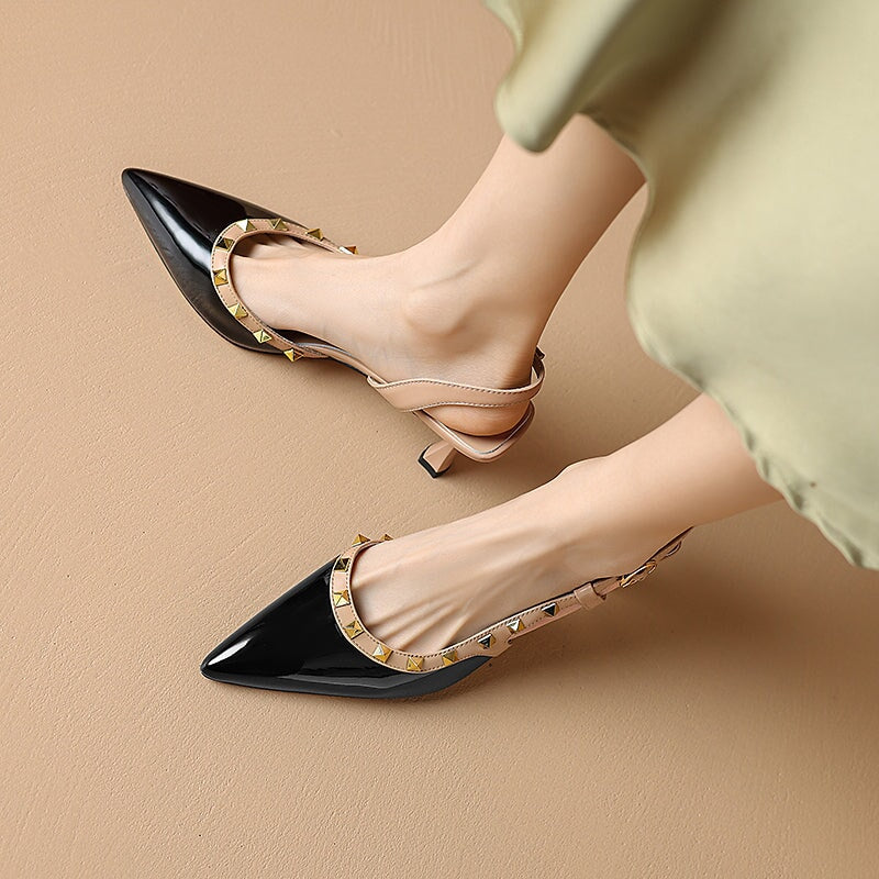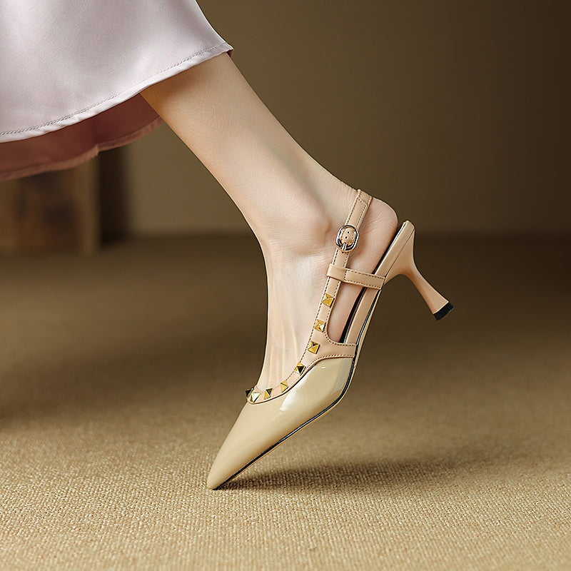 リベット装飾のポイントトゥTストラップディテールローブロックヒール。トップレイヤーレザー製、柔らかく、柔軟で快適、ハンドカット、メタルバックル、あなたのユニークな美しさを身に着けています。