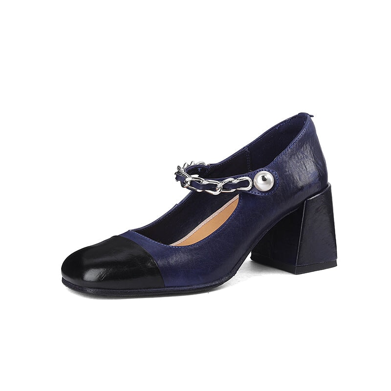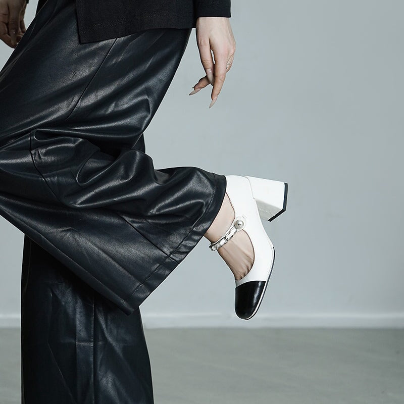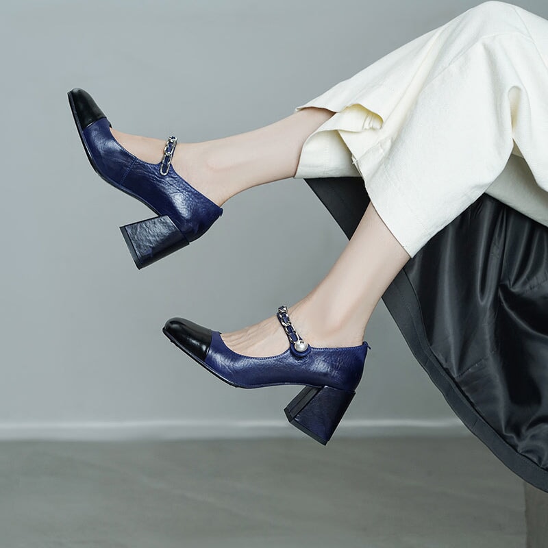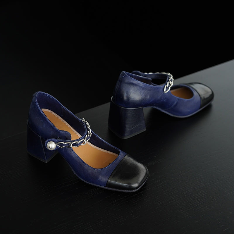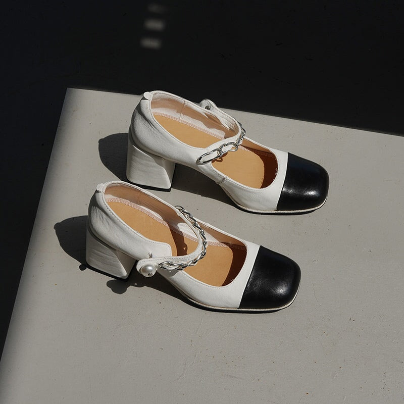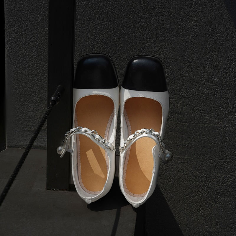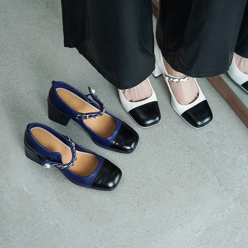 カラーブロッキングを施したシックなスクエアトゥのメリージェーンシューズ