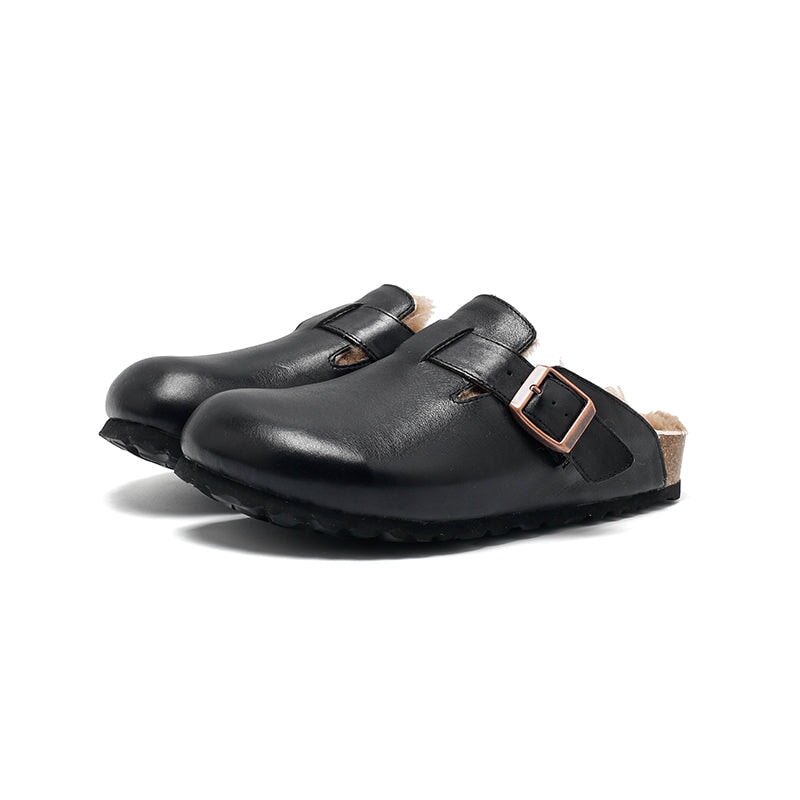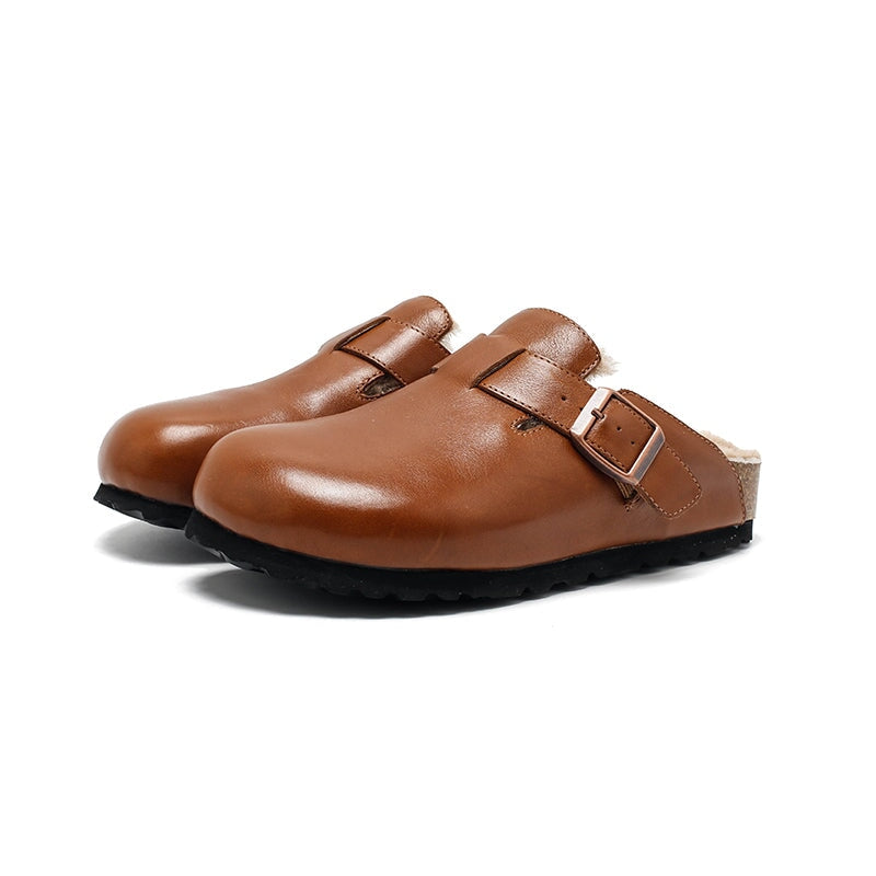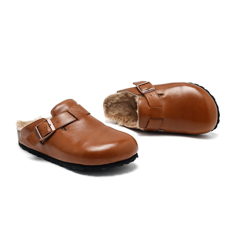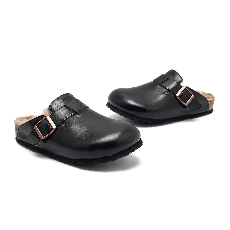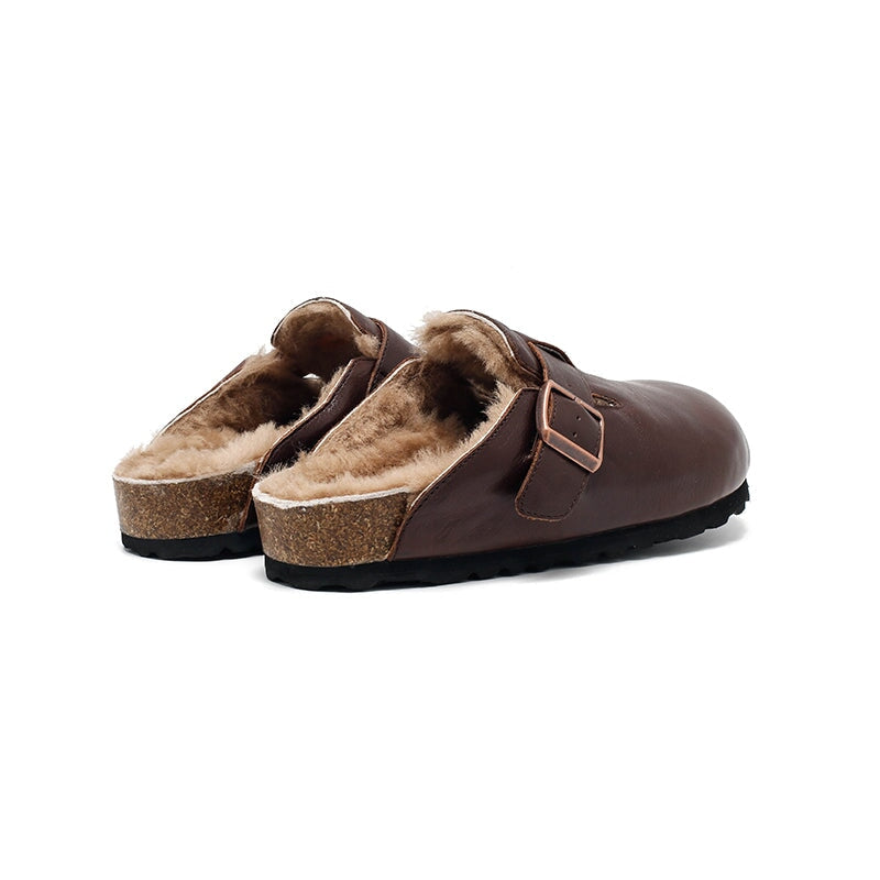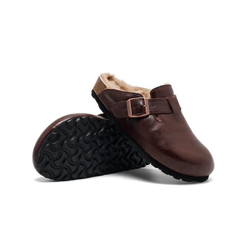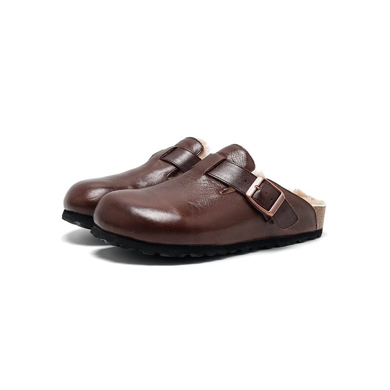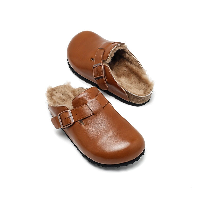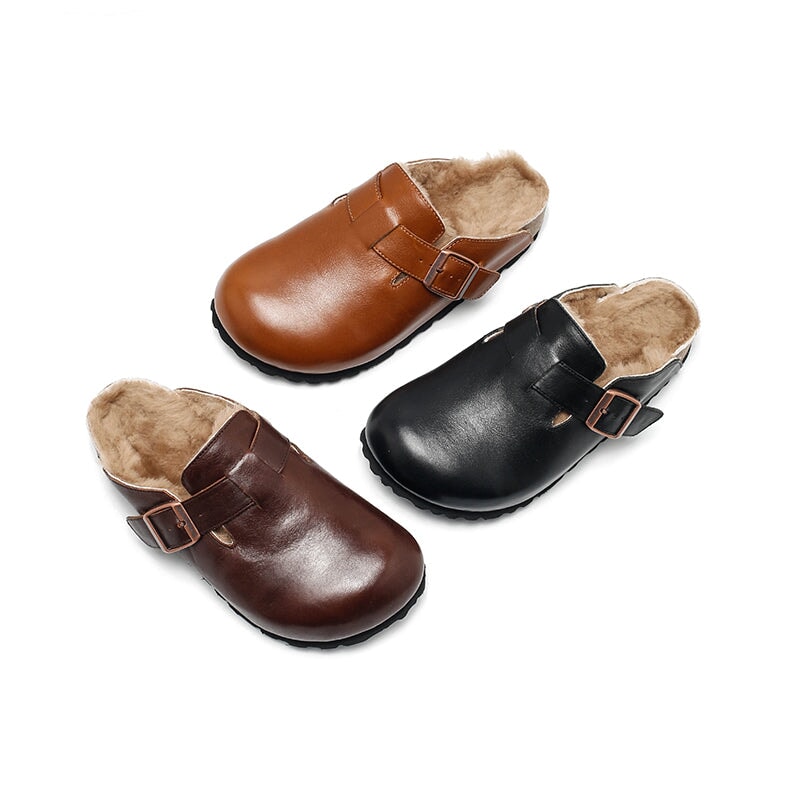 Stay cozy and stylish with these Dwarves Warm Leather Mules for Women. Made from premium top-grain oil-waxed cowhide, these outdoor-ready clog-style slippers feature a soft woolen lining for exceptional warmth and comfort. These shoes are inspired by the classic clog style, but feature a comfortable rubber sole for better flexibility and grip. With the adjustable buckle ensures a snug, secure fit. Ideal for indoor lounging or quick trips outside, these slip-on mules blend function and fashion with a touch of handcrafted charm.