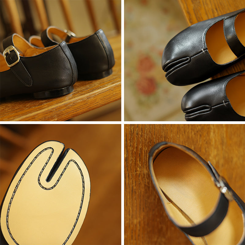 Women’s Split Toe Mary Jane Ballet Flats Soft Leather Double Strap Casual Shoes in Black/Brown/Silver