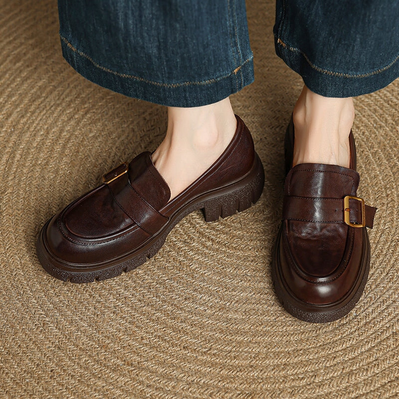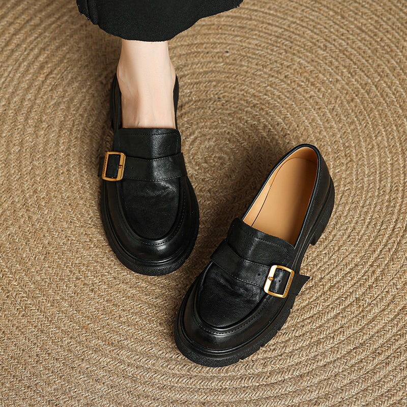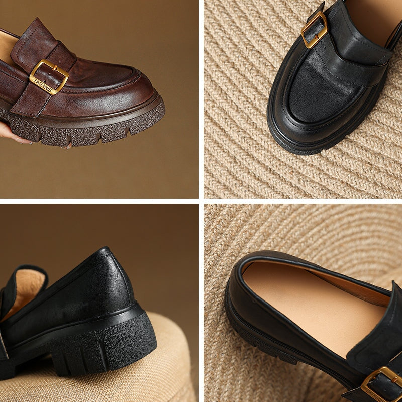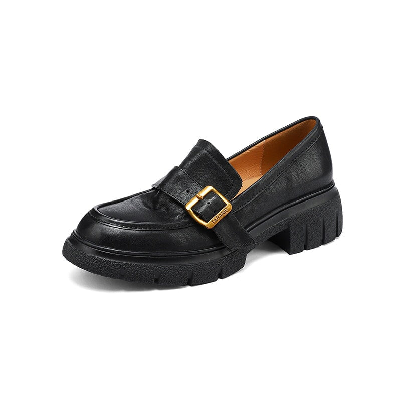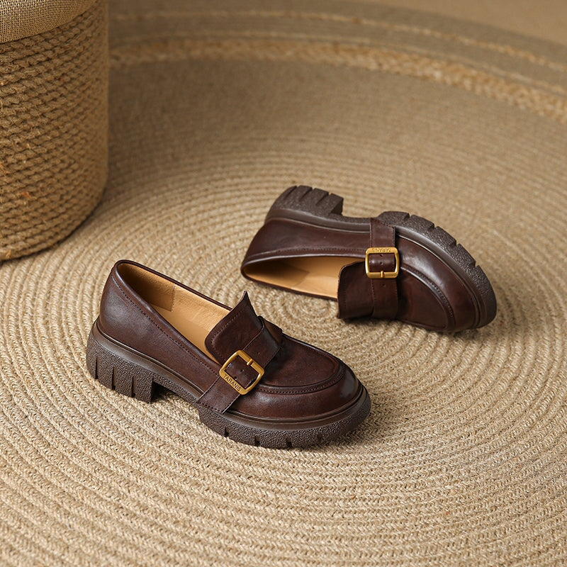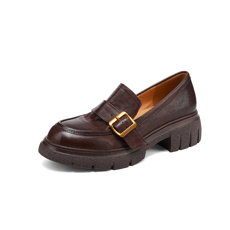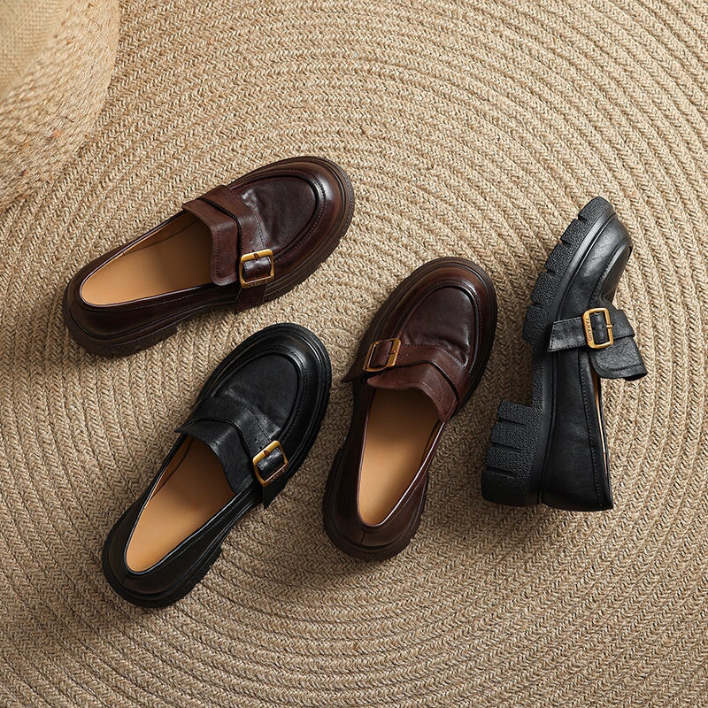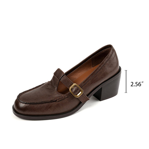 ハンドメイドレザーパンプス Tストラップバックル メリージェーンヒールサンダル レディース ラウンドトゥ ブラック/コーヒー