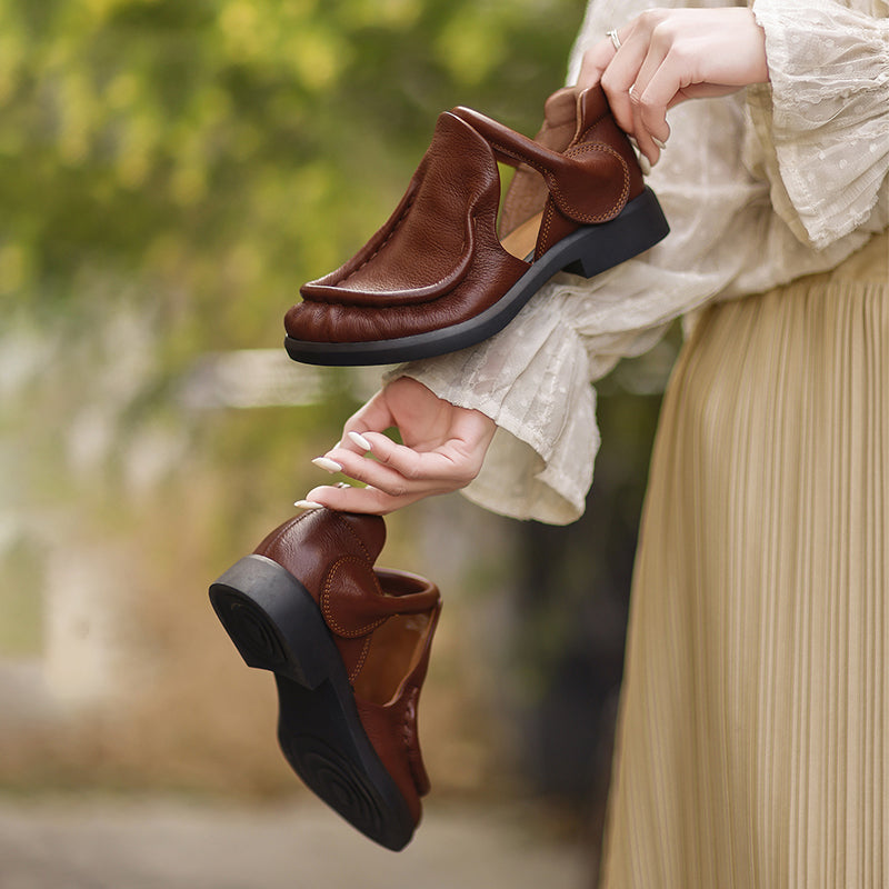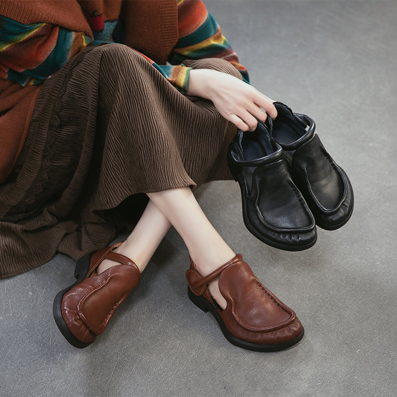Women's Retro Full Grain Leather Mary Jane Shoes with Velcro Strap in Black/Brown