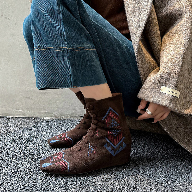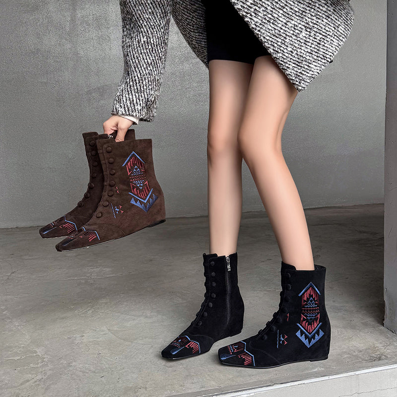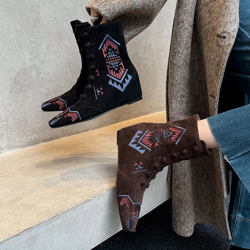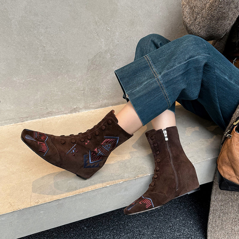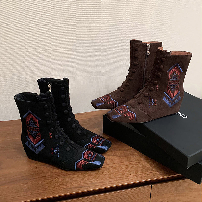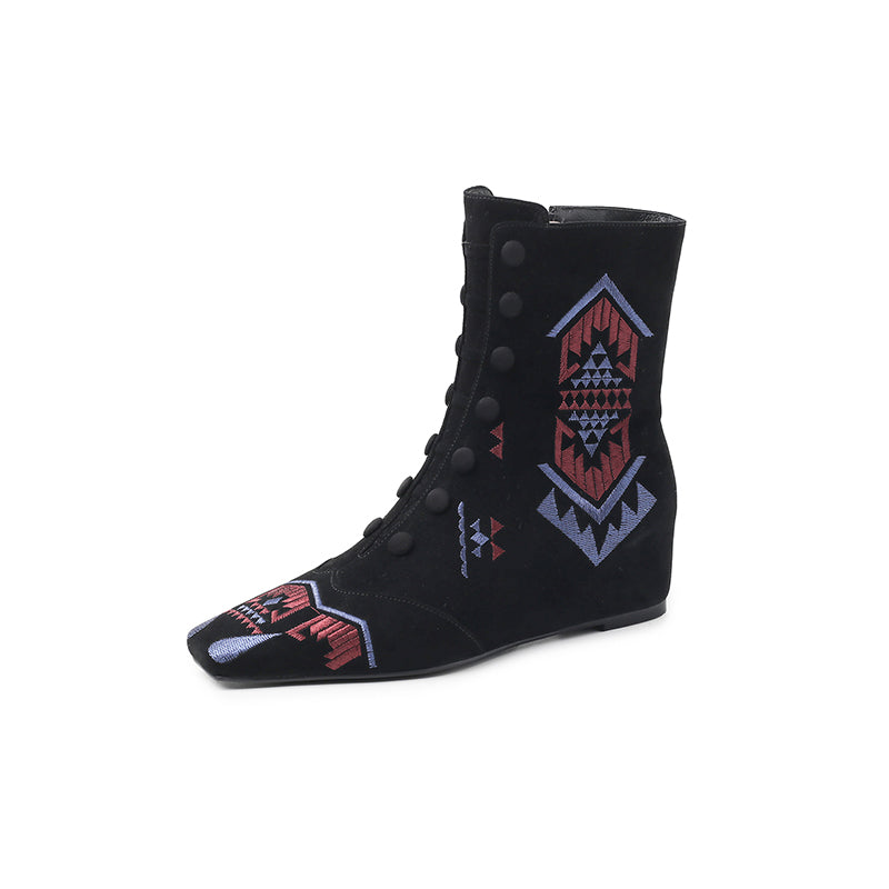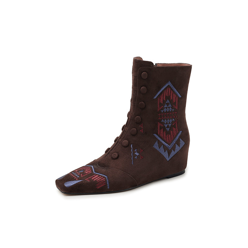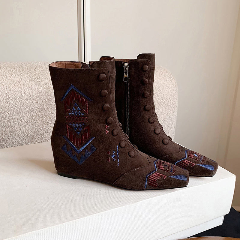 Designer Embroidered Square-Toe Suede Button Short Boots with Hidden Wedge & Side Zip in Black/Brown