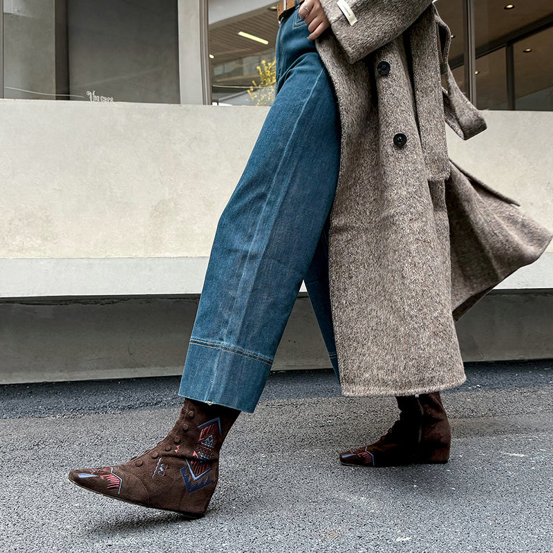 Step into standout style with these women’s designer short boots, crafted from premium reverse suede and finished with bold geometric embroidery. The square toe and slimming silhouette create an elegant, fashion-forward look, while the decorative button design adds unique retro charm. Featuring a convenient side zipper and a hidden wedge for subtle height, these boots are as practical as they are stylish. Choose between short plush lining for winter warmth or smooth leather lining for breathable, year-round comfort. A chic blend of comfort, craftsmanship, and artistic design.
