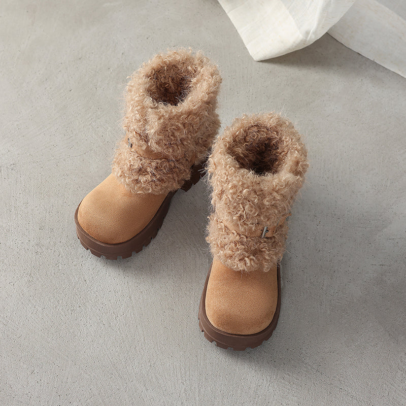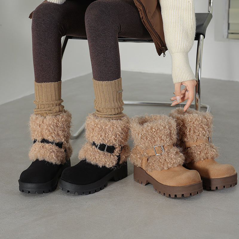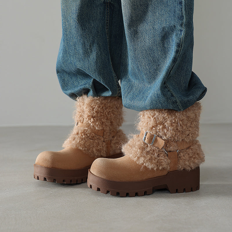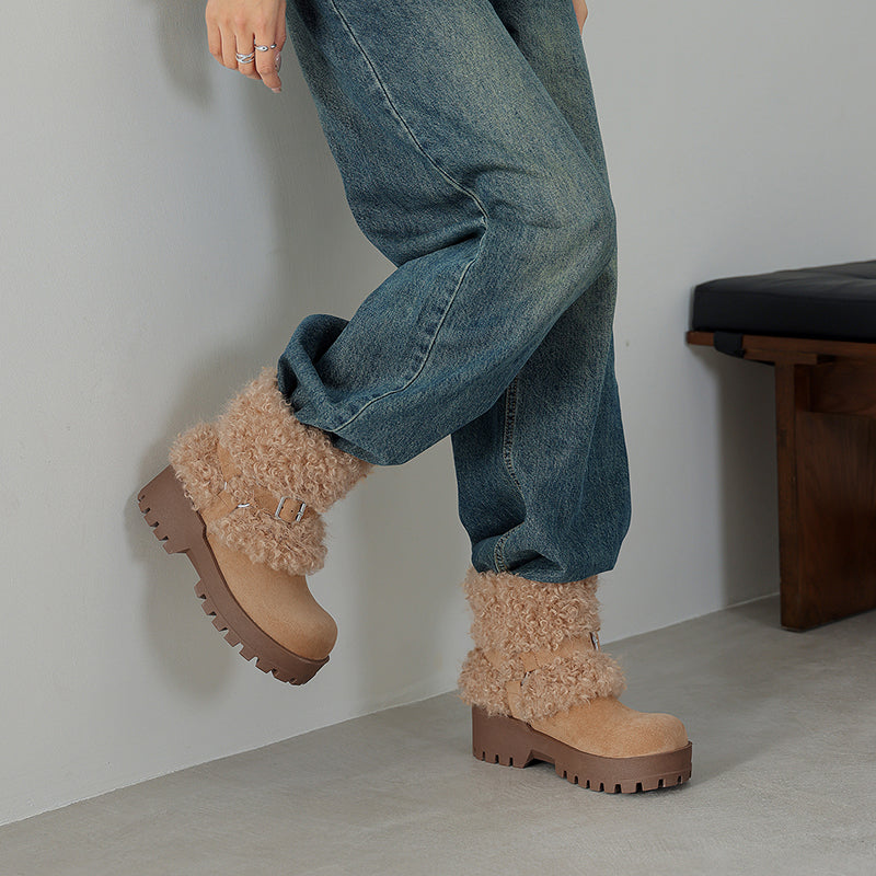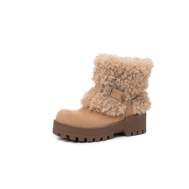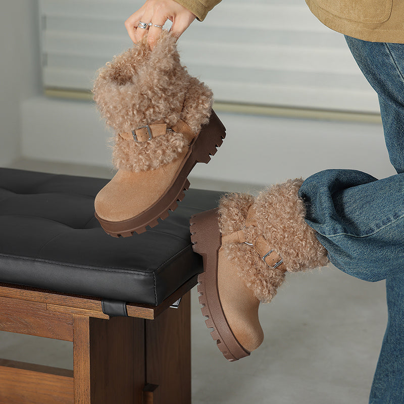 Stay warm and stylish all season with these Women’s Shaggy Chunky Platform Winter Boots, designed with a cozy round toe and a sturdy 55mm block heel for added height and comfort. Made from premium cow suede leather with a plush shaggy wool-blend lining, these short winter boots deliver both warmth and softness. The rugged rubber chunky sole provides excellent grip for cold-weather walking, while the platform design adds trendy, modern flair. Perfect for winter outfits, casual wear, and anyone who loves a mix of comfort, fashion, and durability.