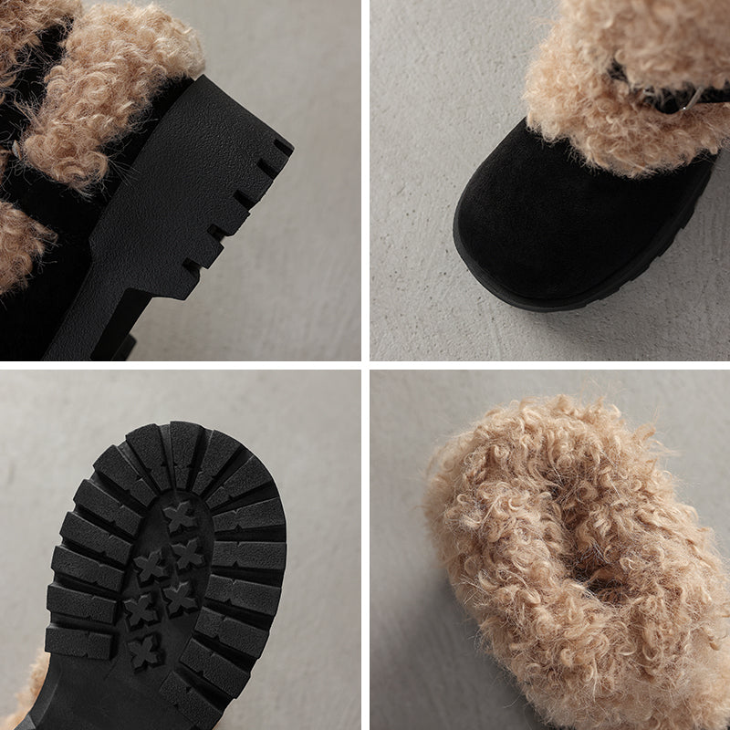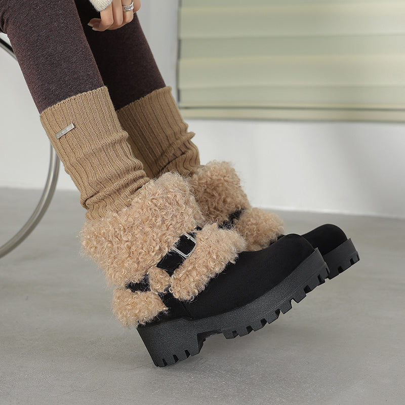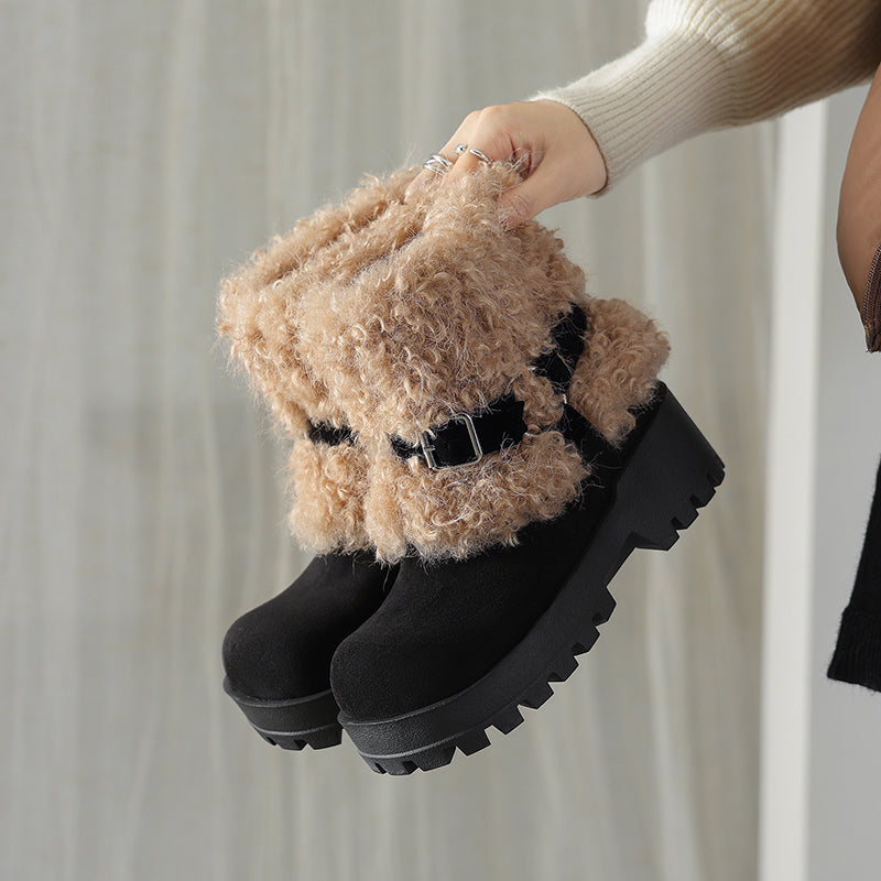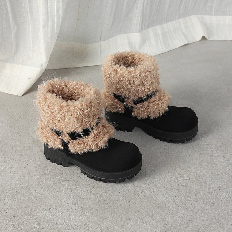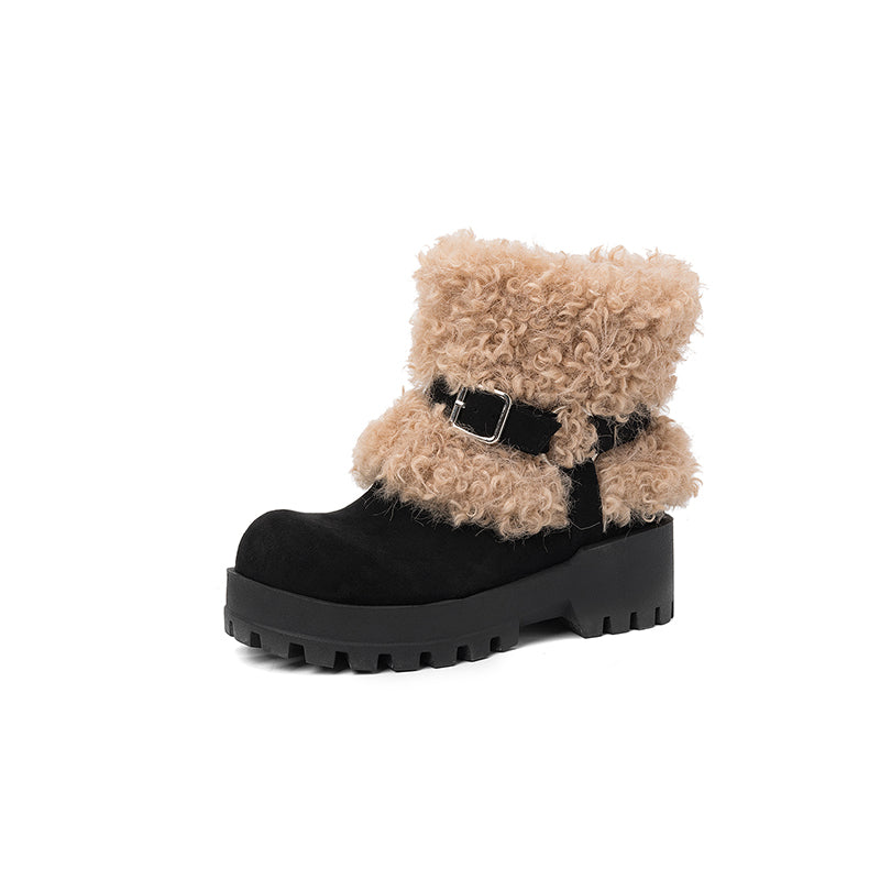 Shaggy Cow Suede Chunky Platform Winter Boots 55mm Block Heel Short Booties in Black/Apricot