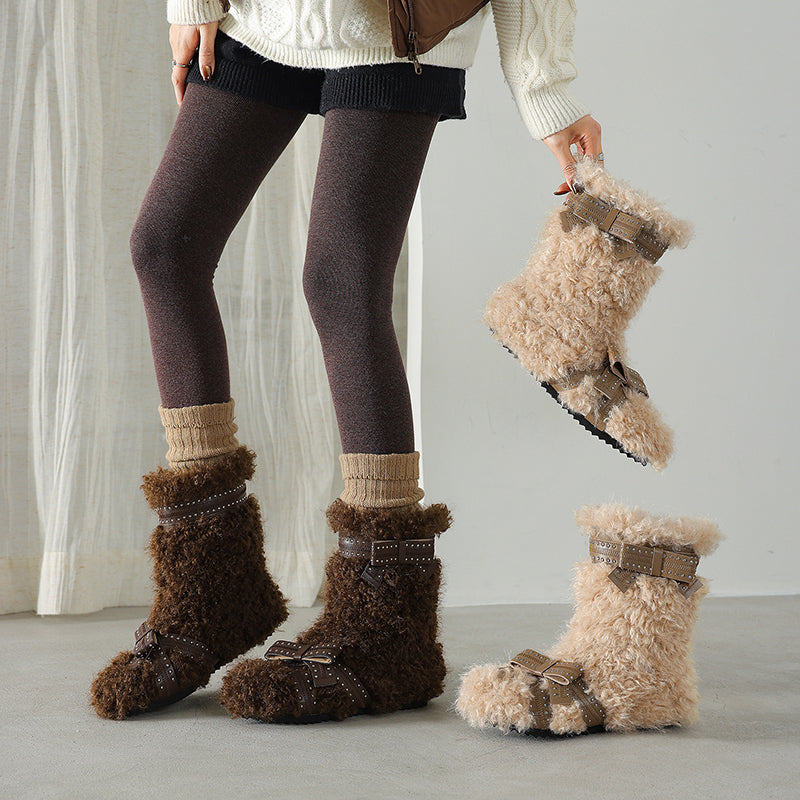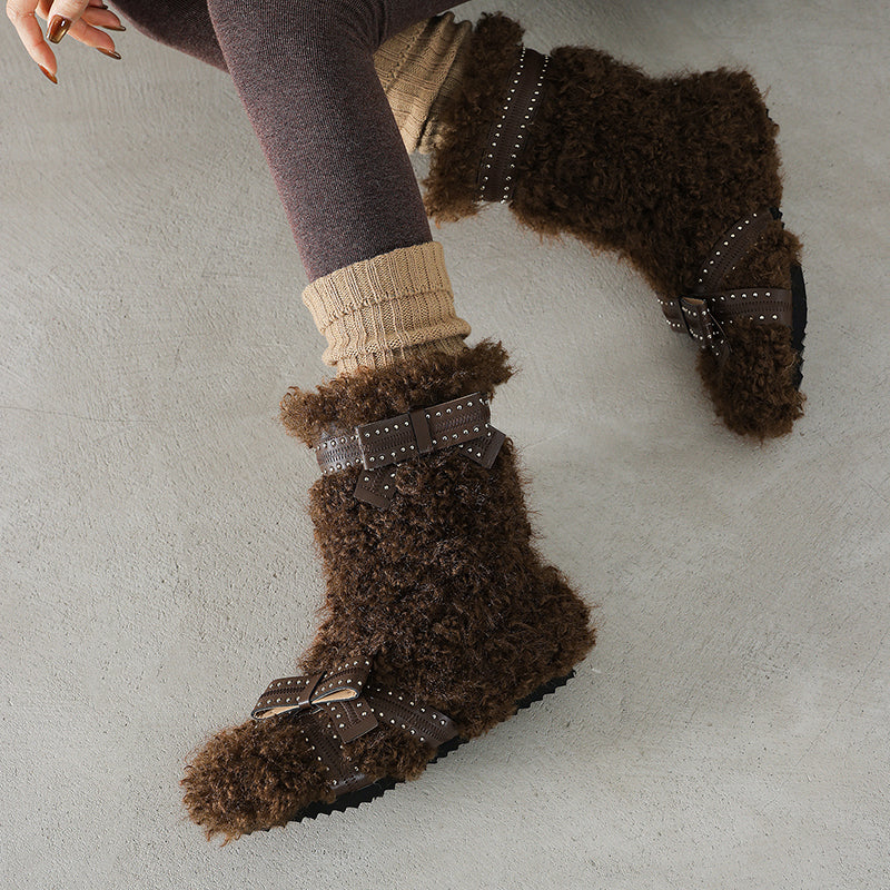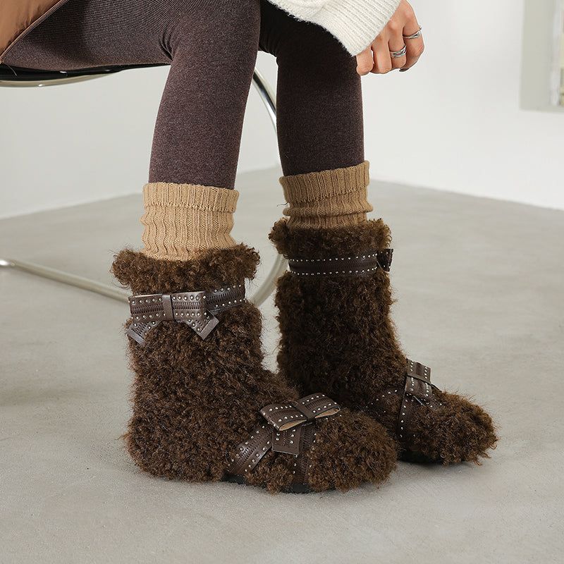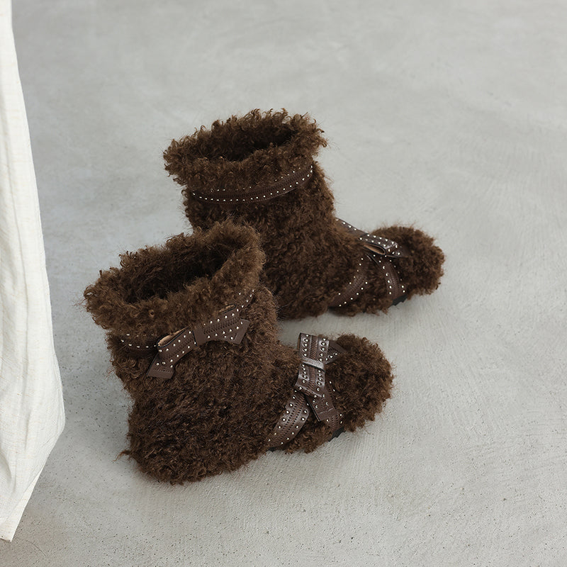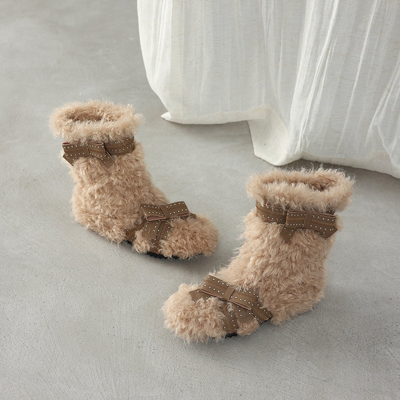 Shaggy Faux Fur Bow Short Winter Boots Cozy Plush Casual Booties in Brown/Apricot