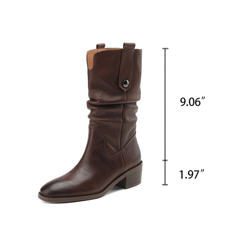 여성용 브라운/블랙 가죽 미드 카프 웨스턴 부츠 - 웨스턴 R 발가락 50mm 블록 힐