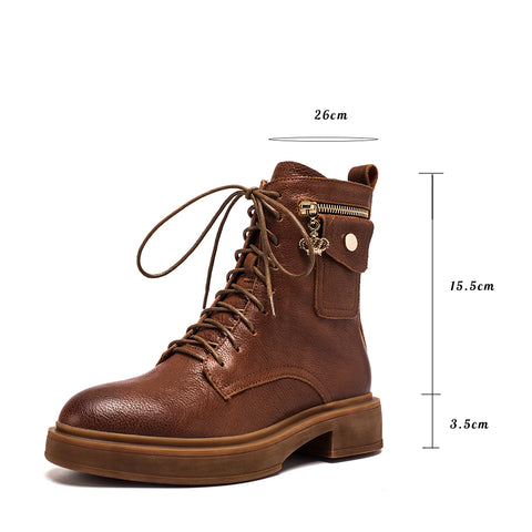 패션 풀 그레인 가죽 컴뱃 부츠 디자이너 레트로 청키 라이딩 부츠 사이드 지퍼 포켓 장식 브라운/블랙