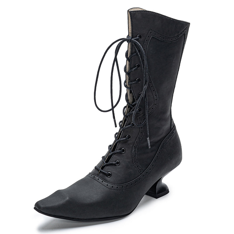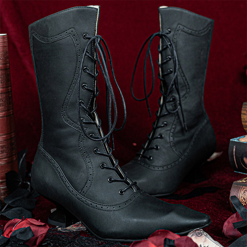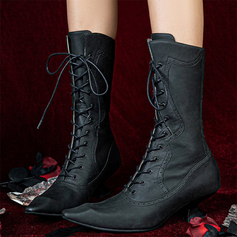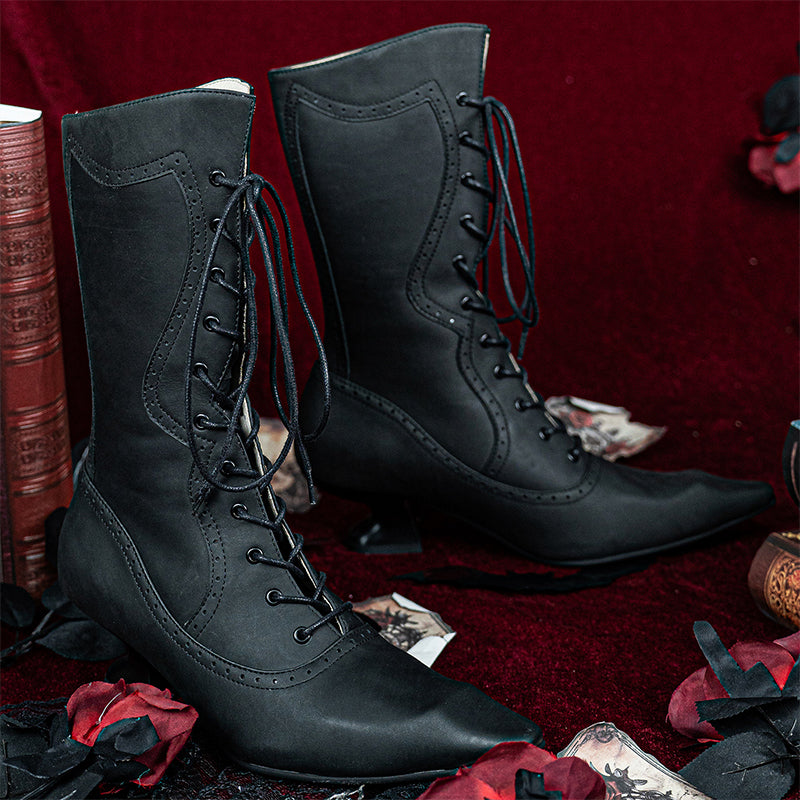 Handmade Gothic Victorian Lace-Up Mid Calf Boots for Women Matte Leather Witch Boots in Black