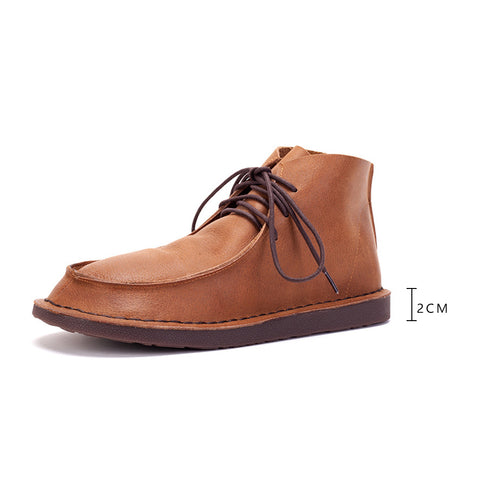 여성을위한 레트로 정품 가죽 소프트 플랫 부츠 라운드 발가락 레이스 업 모리 걸 스타일 와이드 피트 카멜/커피