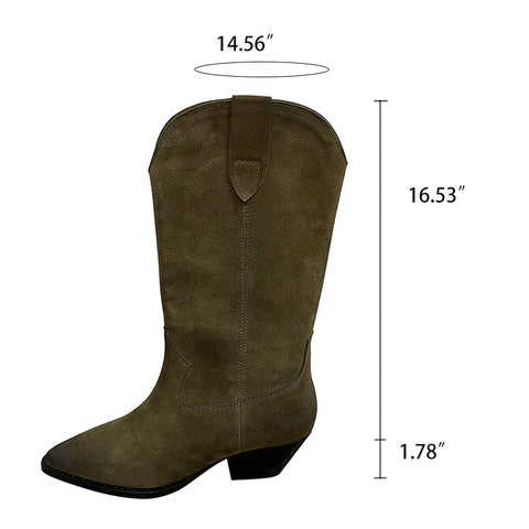 여성 웨스턴 스웨이드 미드 카프 부츠 블록 힐 - 카키/블랙/그레이/브라운 카우걸 부츠 모두 천연 가죽