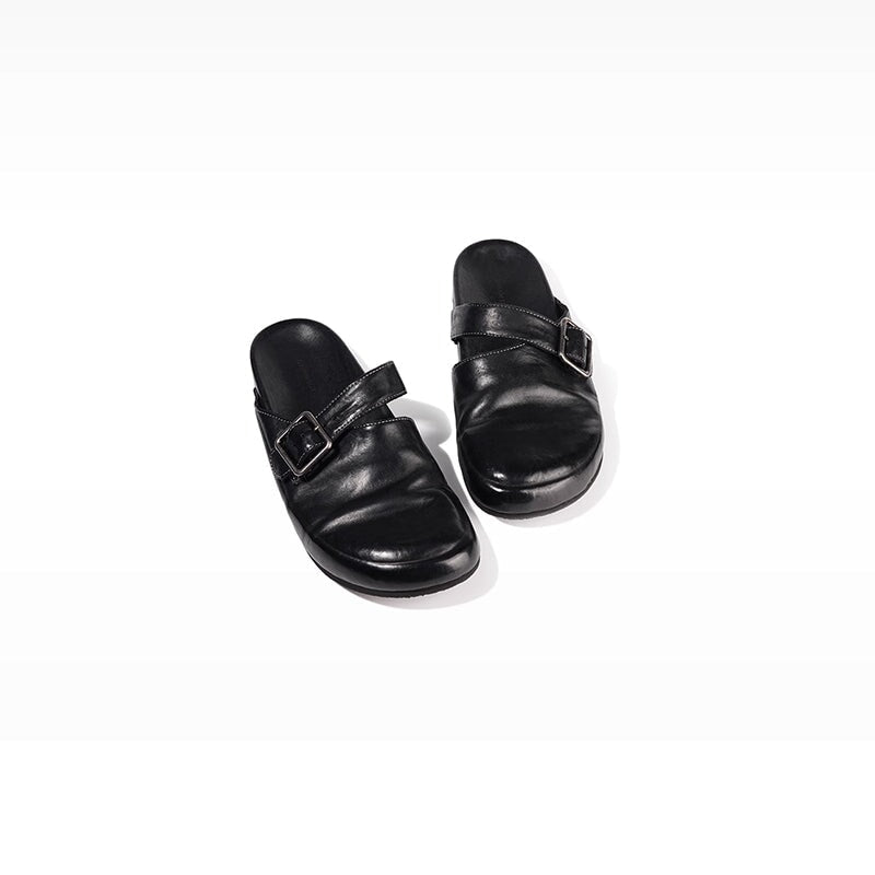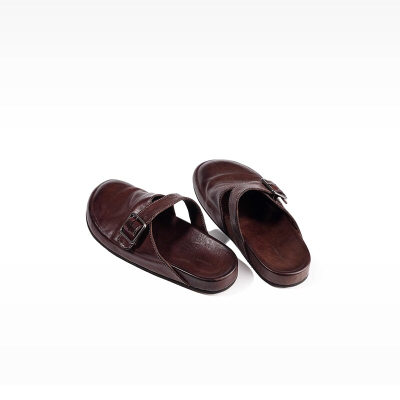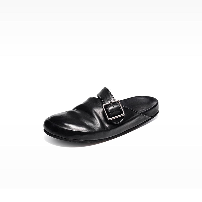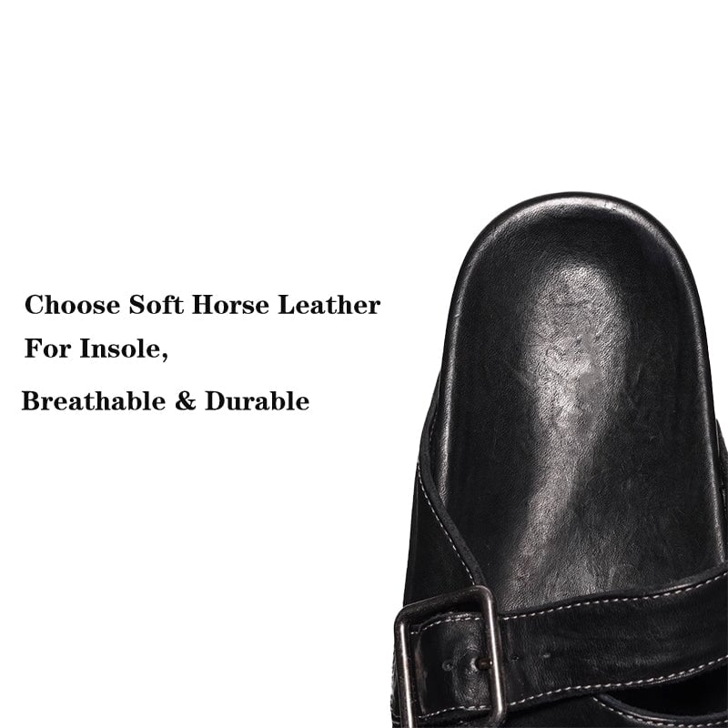 Handmade Washed Horse Leather Buckle Casual Birkenstock-Style Flats Slippers in Black/Brown/Light Yellow