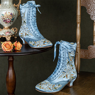 여성용 자수 웨스턴 부츠 블록 힐 숏부츠 모두 천연 가죽