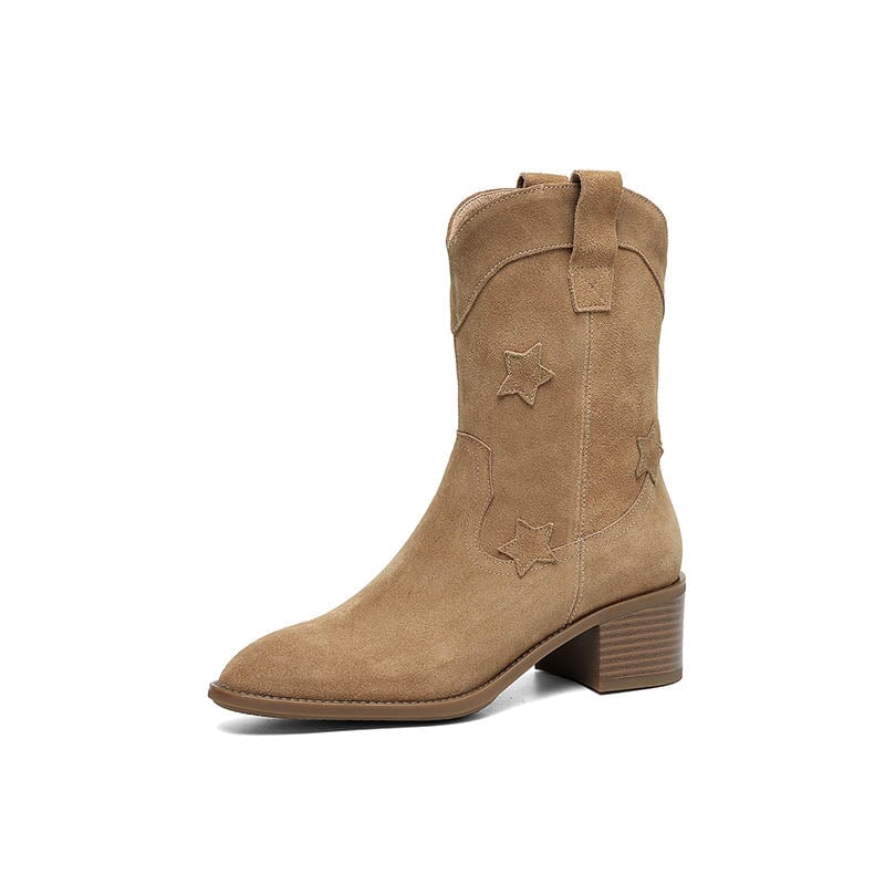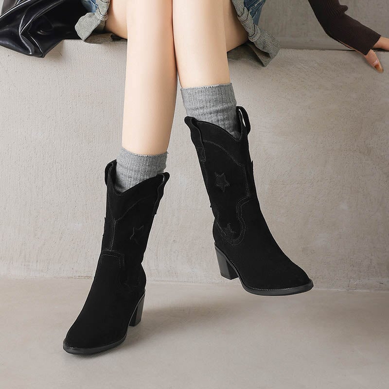 여성용 스웨이드 가죽 미드 카프 부츠 45mm 블록 힐 버클 디테일 블랙/브라운