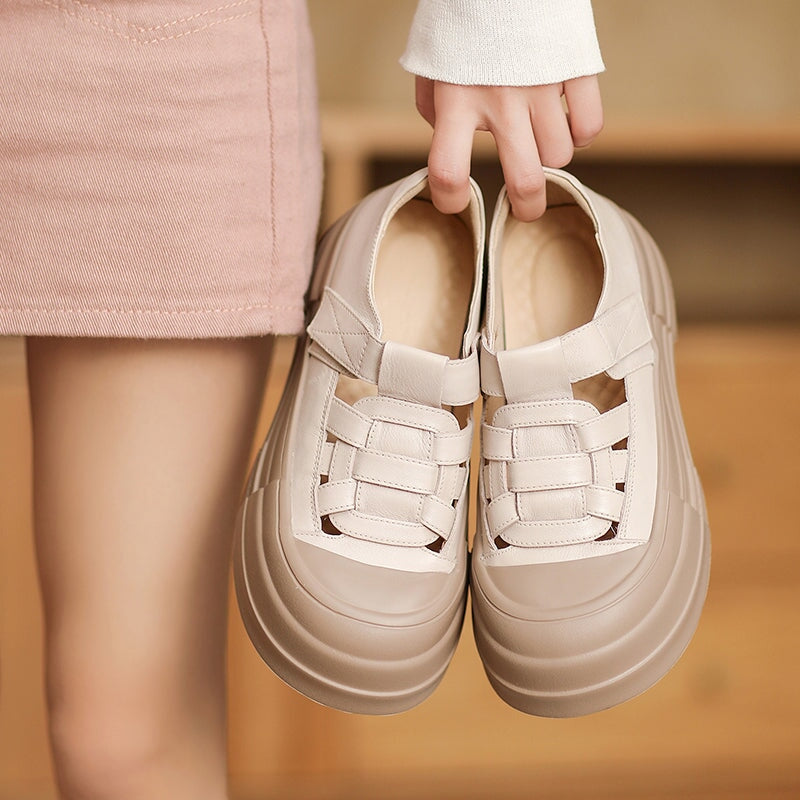 Step into comfort and artisanal style with these casual Roman-style fisherman sandals. Made from premium top-grain cow leather, they feature intricate hollow-out detailing, an easy Velcro strap for a secure fit, and a lightweight 50mm rubber foam platform sole for all-day cushioning. The round toe design ensures a relaxed fit, perfect for everyday wear with a stylish, handcrafted touch.