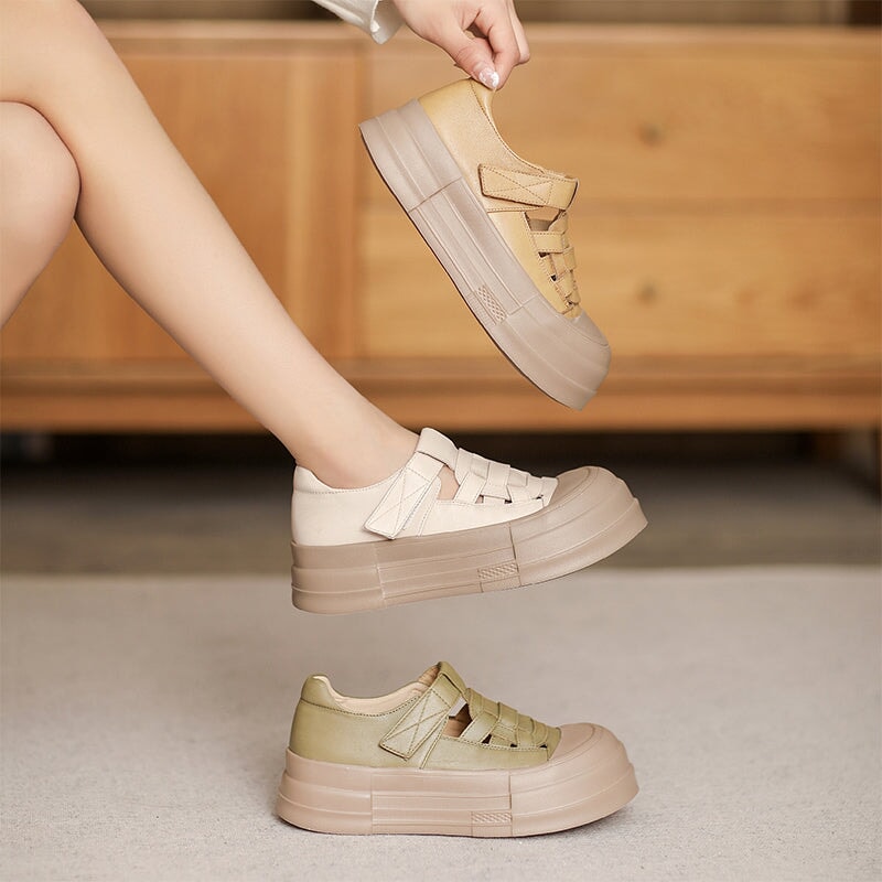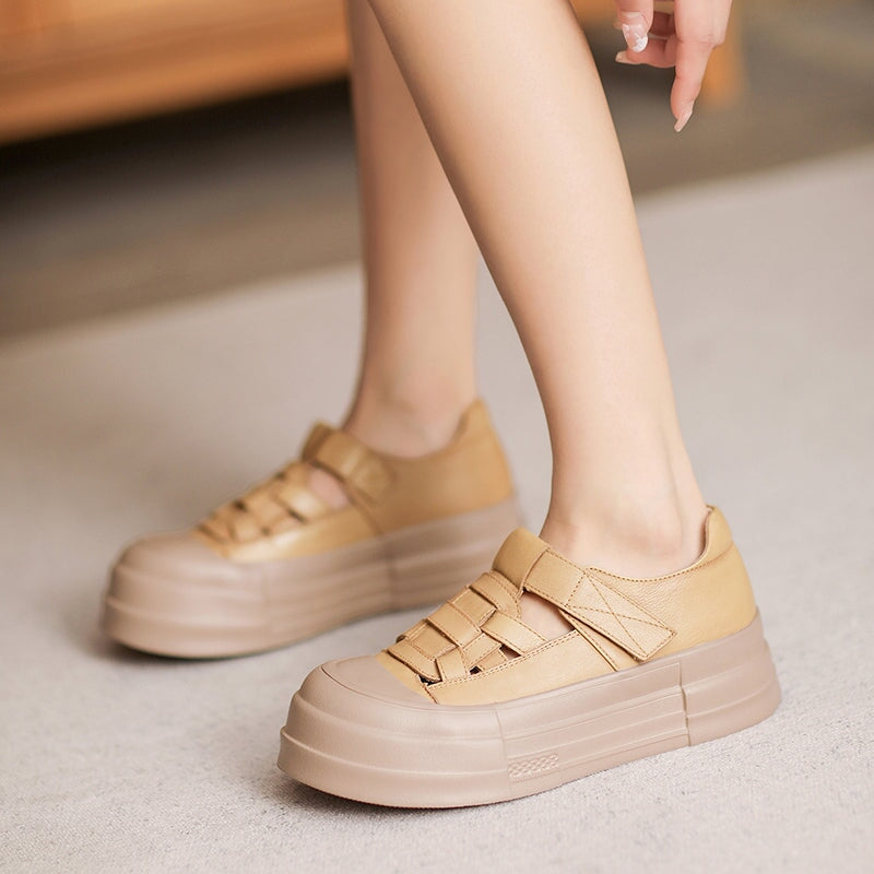 50mm Platform Cow Leather Hollow-Out Roman Fisherman Sandals with Velcro in Beige/Yellow/Green