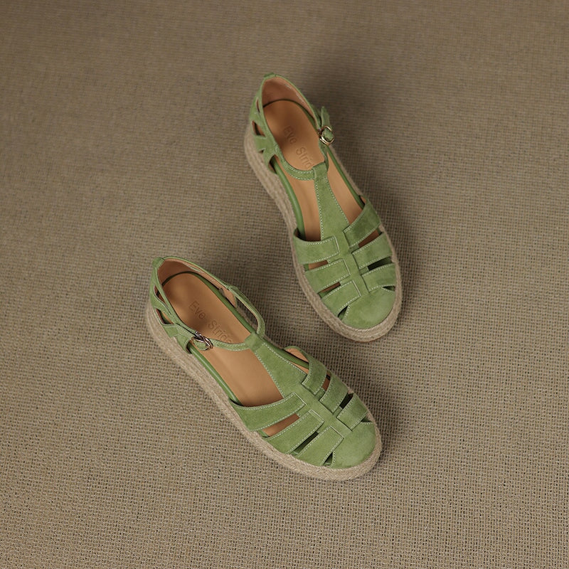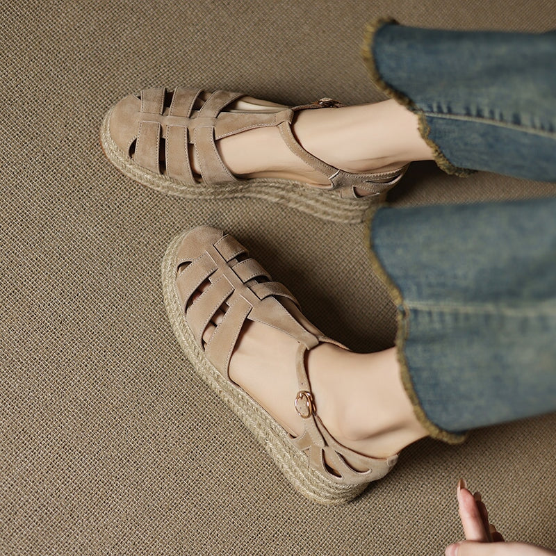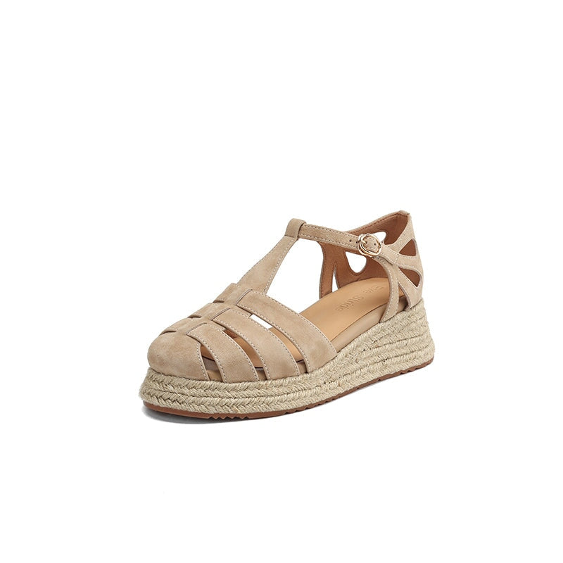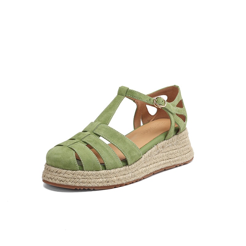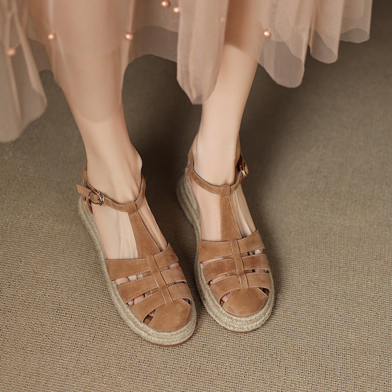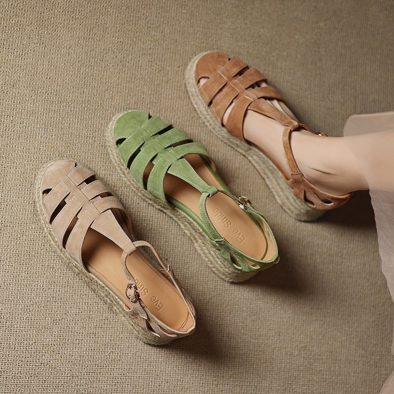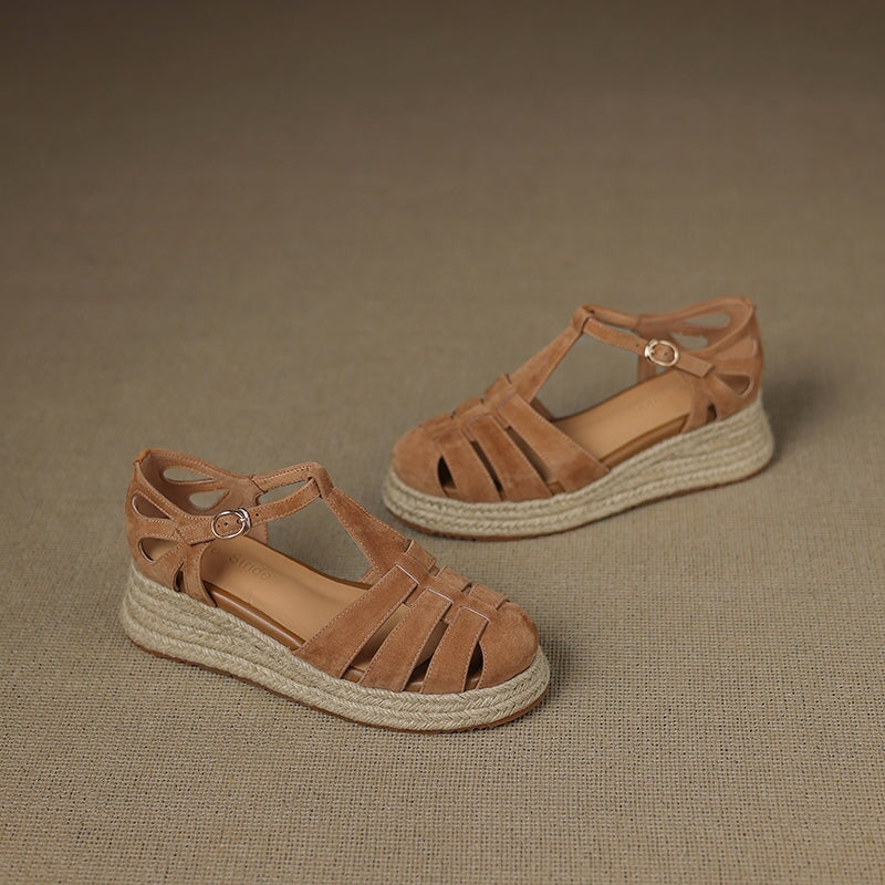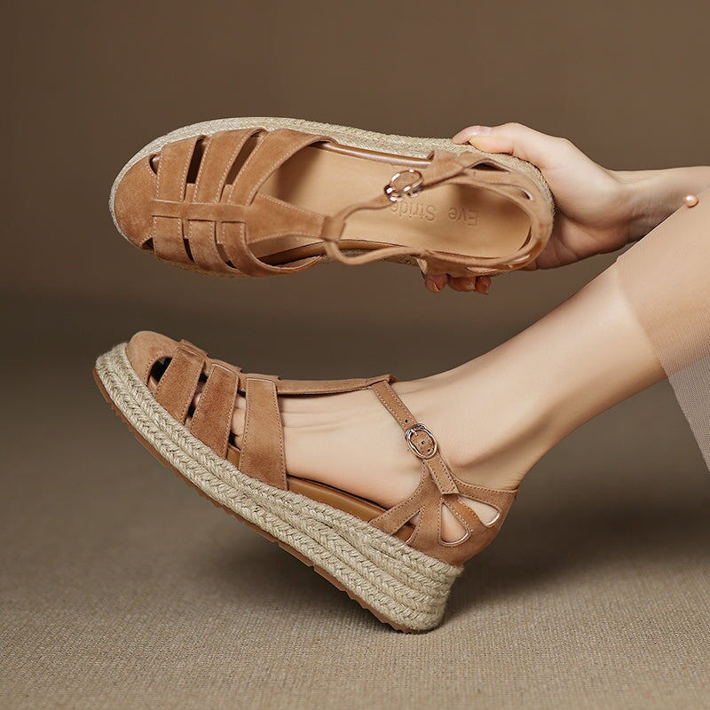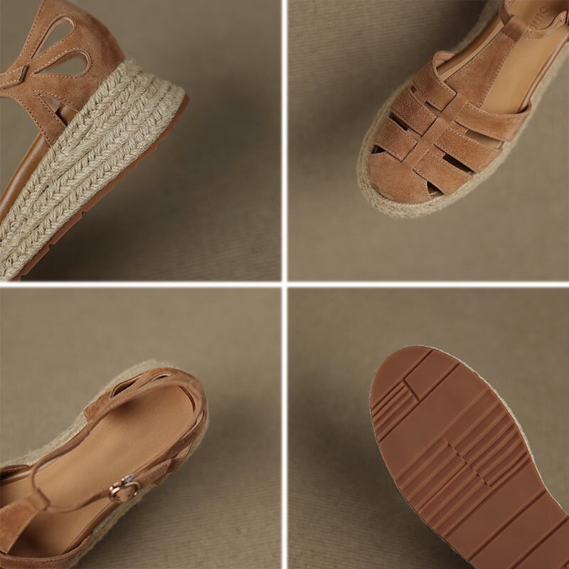 These handmade platform Roman sandals are made from premium first-layer sheepskin suede leather, featuring a round closed toe and breathable hollow-out design. The braided espadrille-style edge adds a unique artisanal touch, blending traditional craftsmanship with modern comfort. Finished with a durable, non-slip rubber sole, these sandals are perfect for casual outings, summer vacations, and everyday wear.